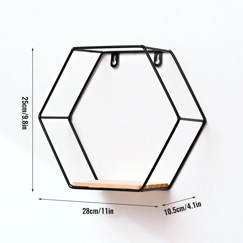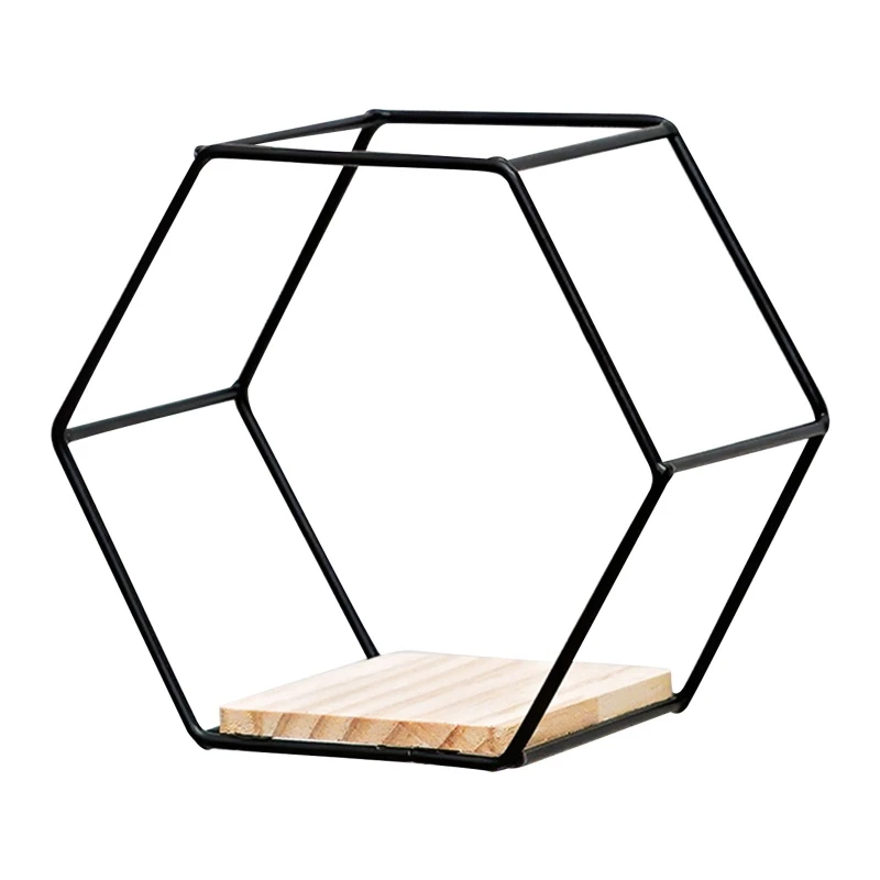 Эта шестиугольная полка изготовлена из железа и древесного материала, она прочная и износостойкая.