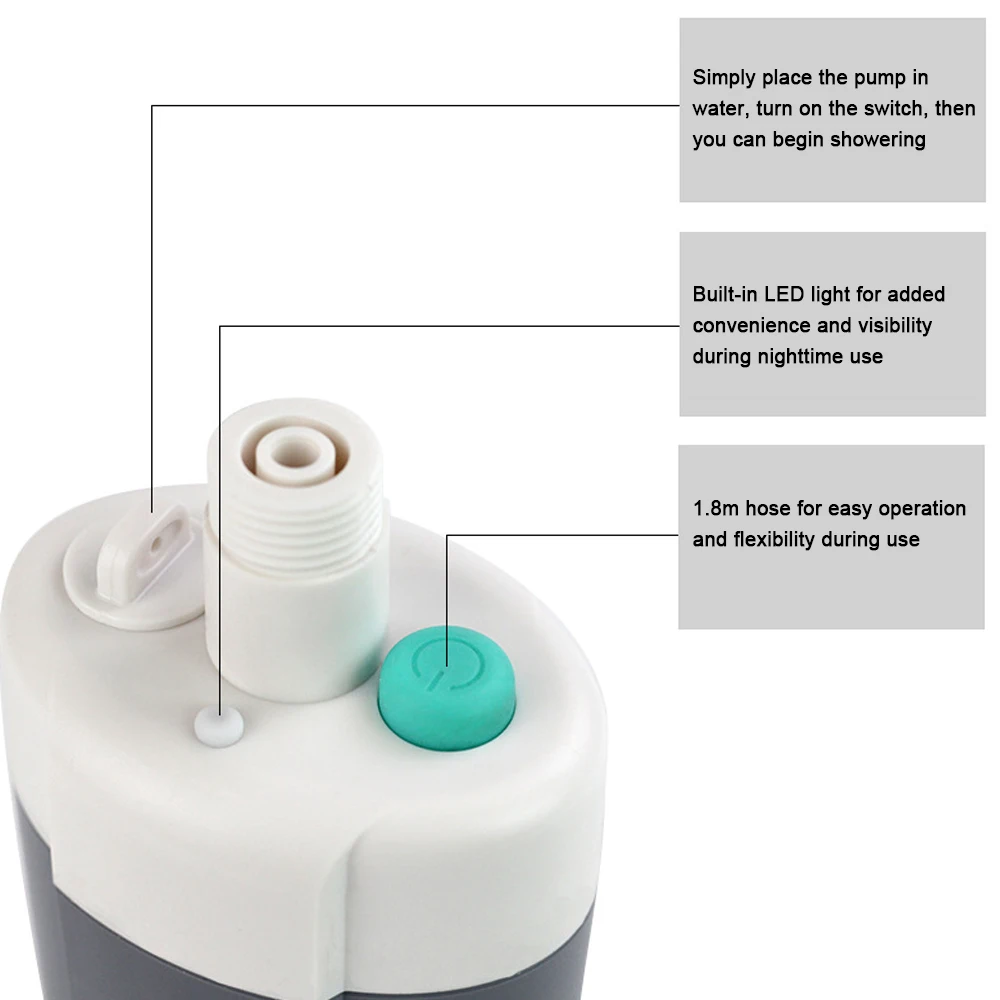 Просто поместите помпу в воду, включите выключатель, и вы сможете принимать душ.