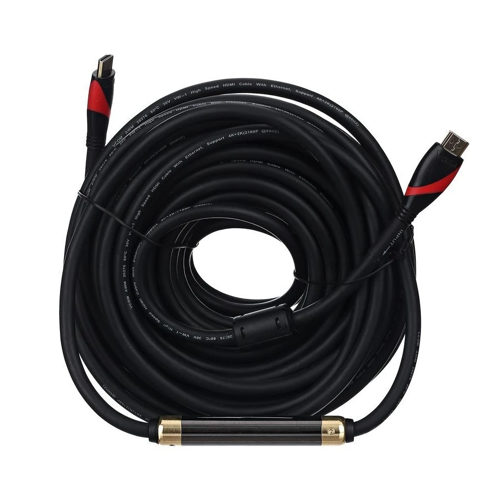 Высокоскоростной кабель HDMI версии 2.0 с двумя ферритовыми фильтрами применяется для соединения компьютеров, Blue-Ray и DVD плейеров c видео проекторами,световыми и информационными табло и предназначен для передачи аудио и видео сигнала Full HD 1080P, Ultra HD 4K с разрешением 38402160, Full 4K с разрешением 40962160, с максимальной пропускной способностью канала до18 Гбит/сек . Фильтры служат для уменьшения помех. Данный кабель может быть использован и для подключений типа «компьютер- монитор или телевизор» но при этом качество сигнала будет ниже, так как мощности по 5в будет недостаточно. Подключения данного типа обычно используют кабель HDMI длиной до 5 метров. Для передачи HDMI сигнала на расстояния более 5м без потери качества используйте оптические HDMI кабели.