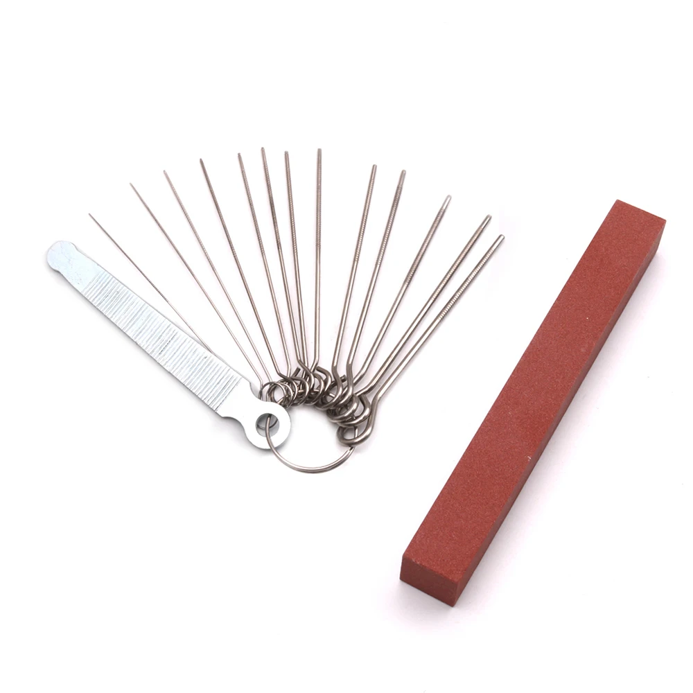 74 шт. инструмент для настройки гитары Комплект: 10 x Fret Crowning Luther файл, 13 x игольчатый файл, 1 x шлифовальная губка, 1 x шлифовальный камень, 12 x Гитарный Мост Pin, 9 x датчик радиуса подструны, 1 x щуп, 1 x струнная экшн-линейка, 2 x защита от Лада, 8 шестигранных гаечных ключей, 1 x струнный разбрасыватель, 1 x протирочная ткань, 1 x намотка гитарной струны, 1 x плоскогубцы струнной резки, 6 * гитарная струна (набор), 5 x Гитарный выбор (случайный цвет), 1 x сумка для переноски.