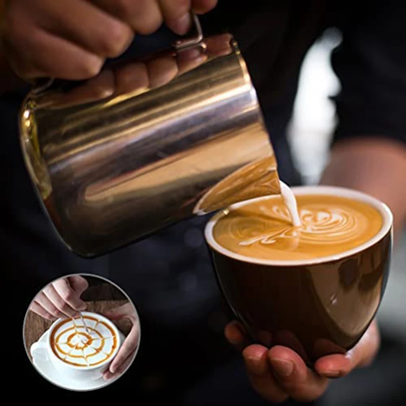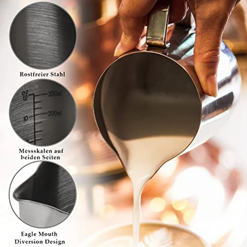 Многофункциональный: молочный кувшин из нержавеющей стали может помочь вам во многих отношениях, может сделать и испарить латте Молочный Крем; Измерьте любой тип жидкости, подходит для офиса, кафе, отеля, отдыха, А также в качестве вечерние или подарок на Новый год.