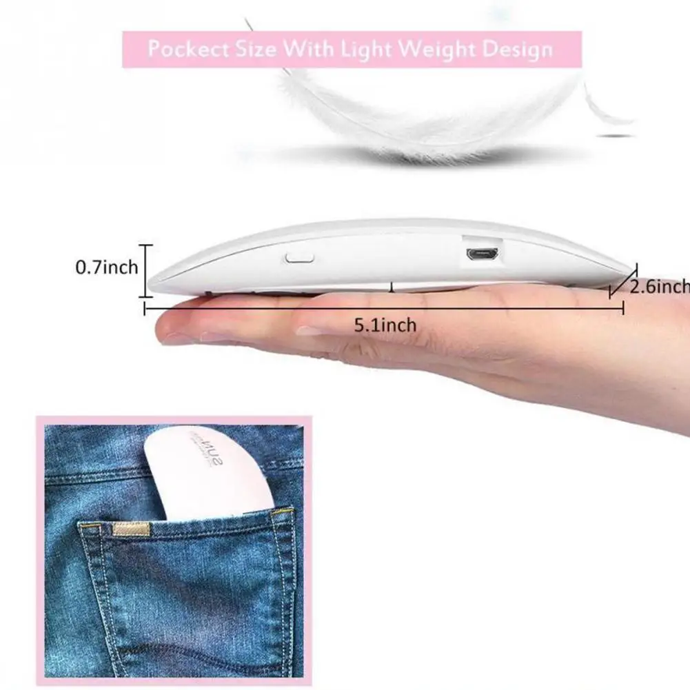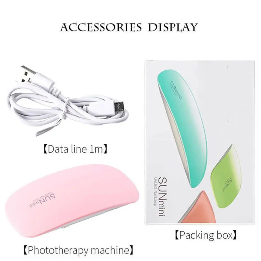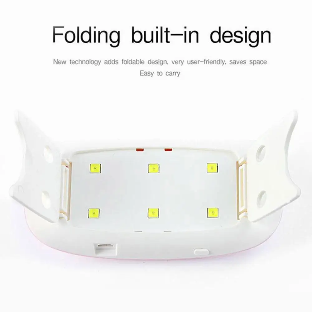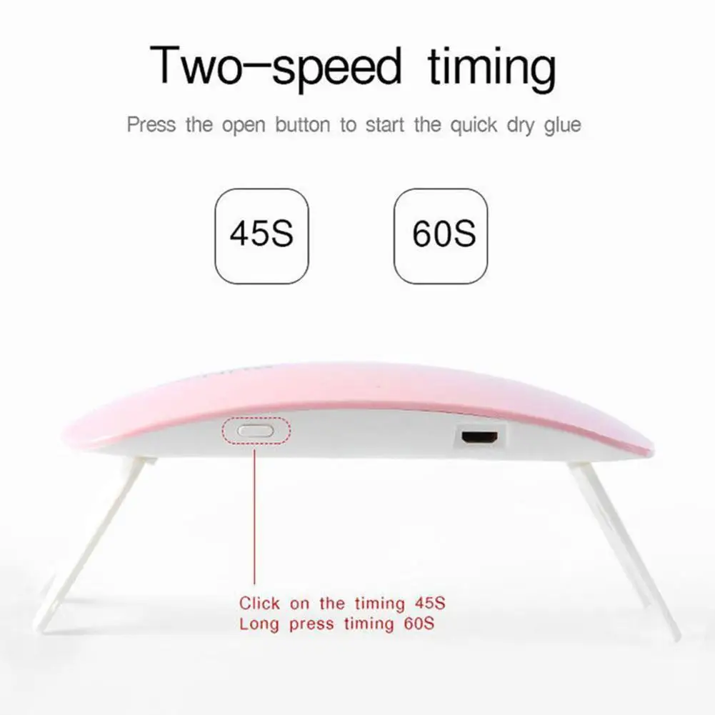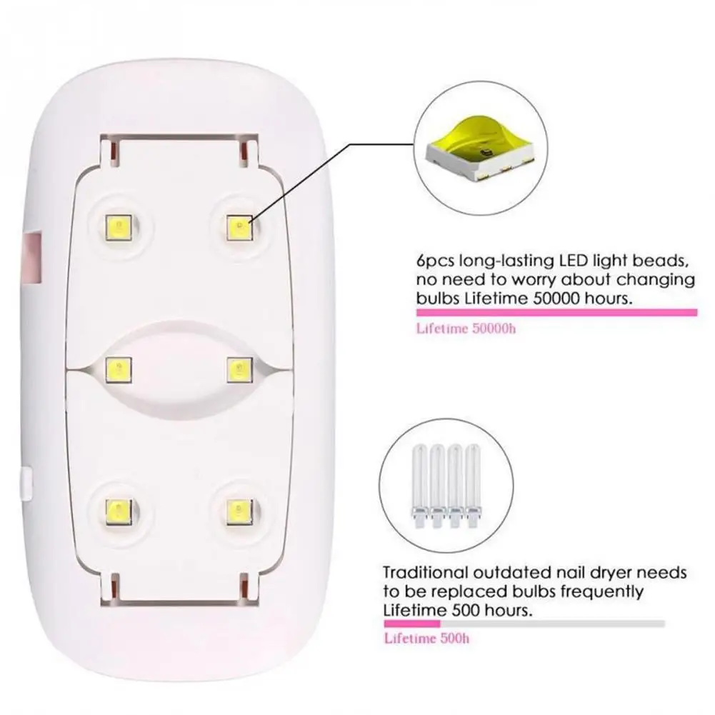 Характеристики: 6 Вт Высокая мощность, 6 светодиодных ламп-источников света, высыхает весь клей для лака для ногтей, источник света не режет глаза, не черные руки, не щиплет, имеет 2 функции синхронизации.