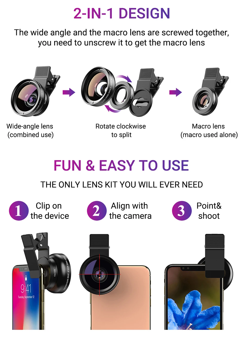 Примечание: Этот список предназначен только для объектива, мобильный телефон не входит в комплект. Светильник вспышки будет заблокирован при использовании объектива. Посылка включает: 1 x широкоугольный объектив и макрообъектив 1 x Универсальный зажим 1 х Черная сумка0. Широкоугольный объектив 45x ---- позволяет захватывать больше пейзажей, чем обычно, отлично подходит для городских пейзажей и больших групповых фотографий.
