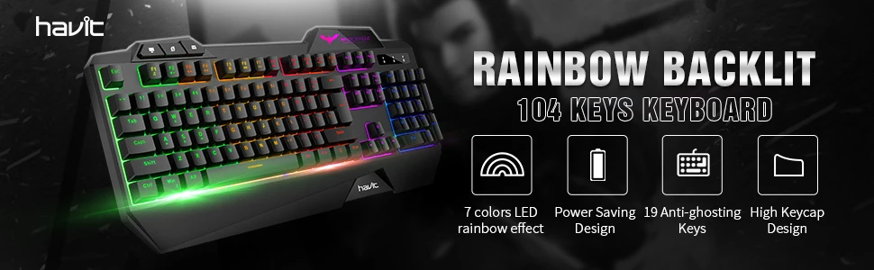 7 видов цветов светодиодный эффект радуги, подсветка может переключаться между Rianbow 7 цветов света, режим дыхания и выключения .. До 19 клавиш без коллизии, 12 групп комбинаций мультимедийных клавиш (FN + F1 ~ F12), Взаимозаменяемые клавиши «WASD» и клавиши WIN могут быть отключены для игр.