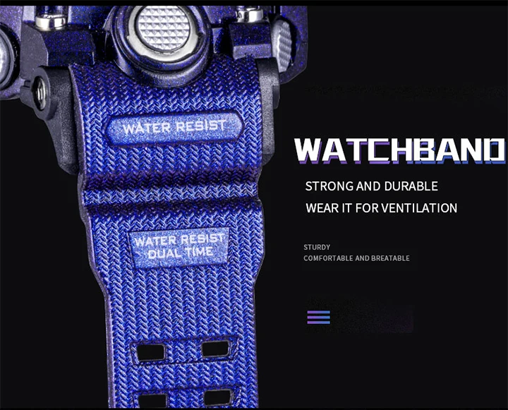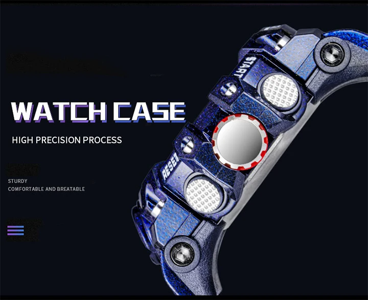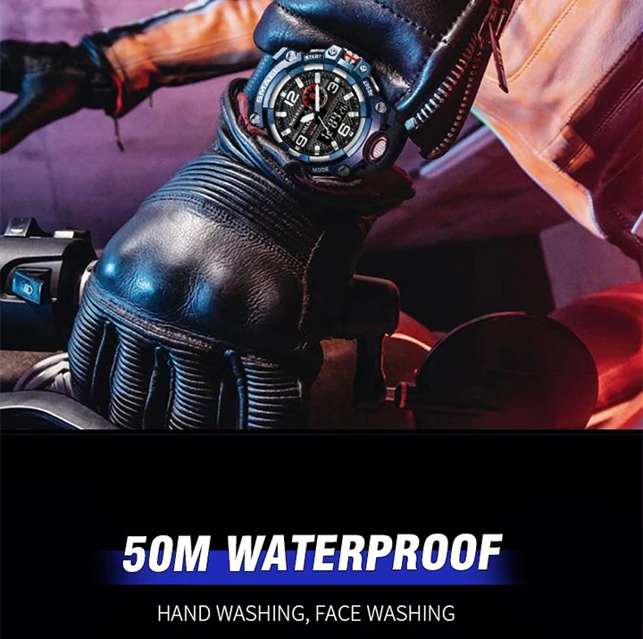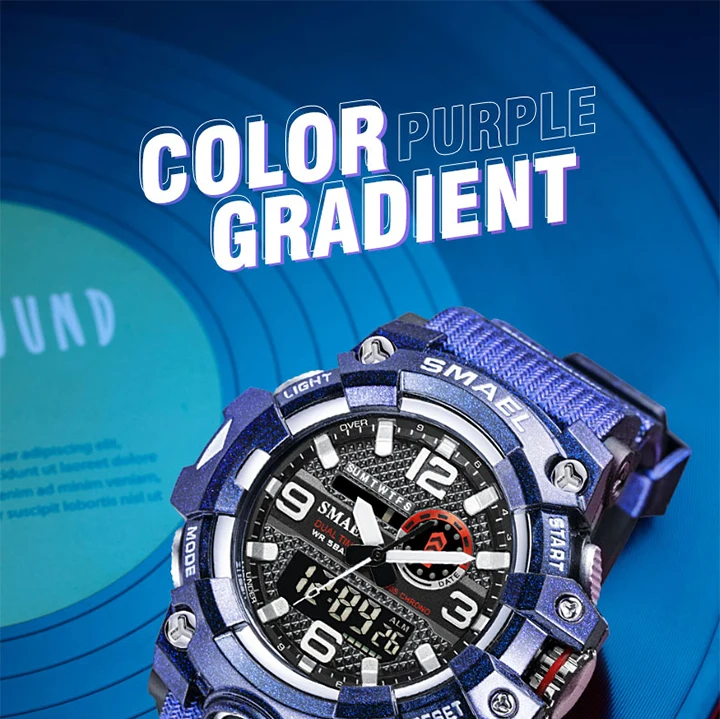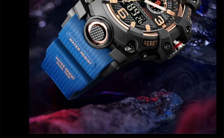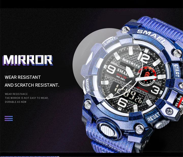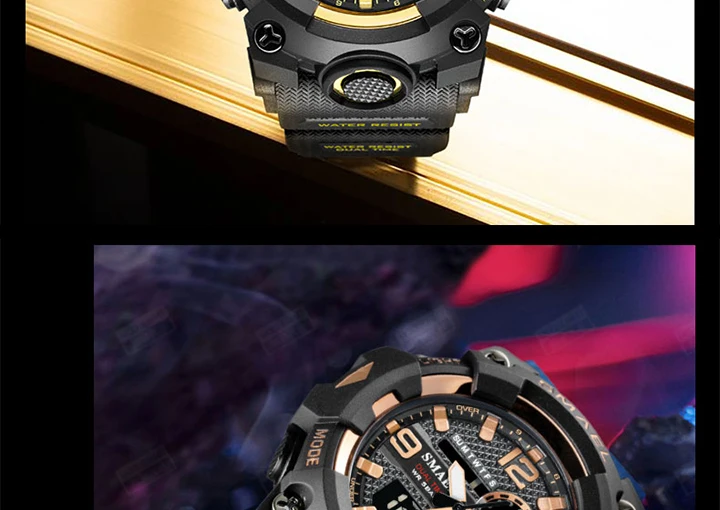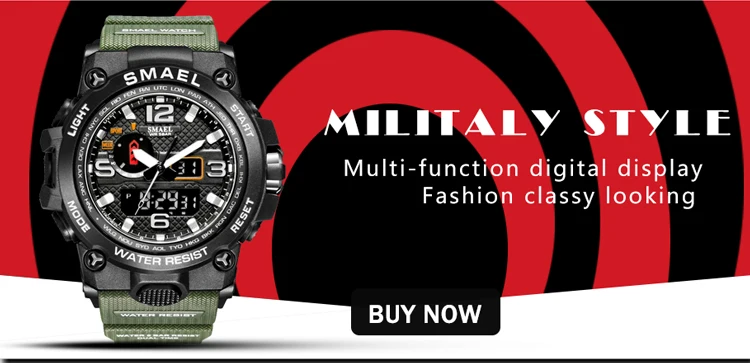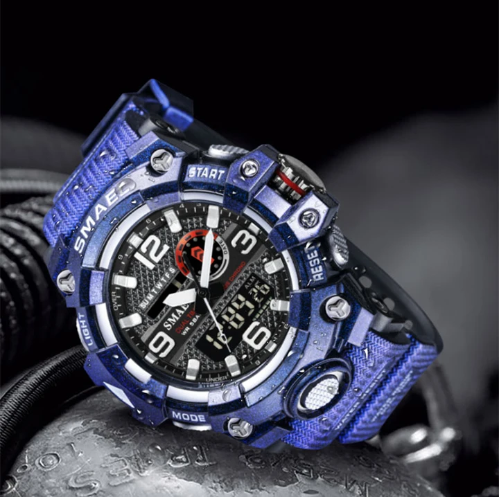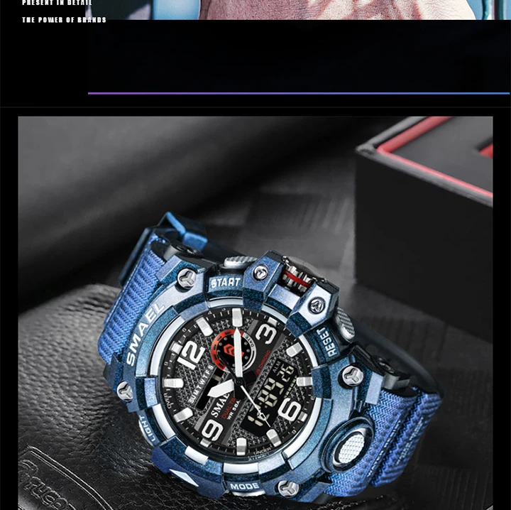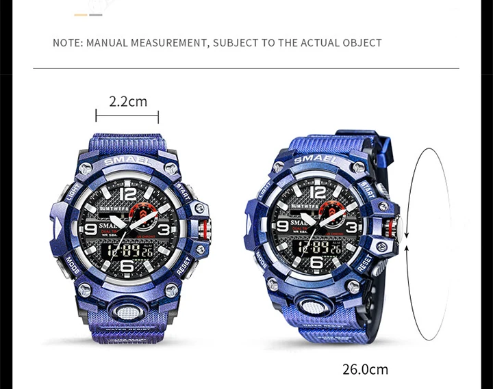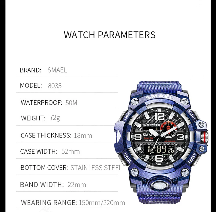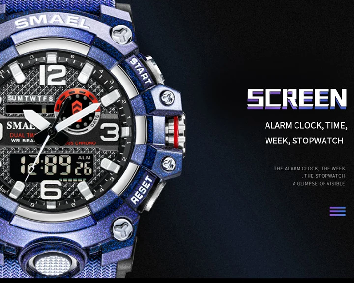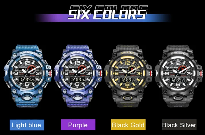 1. Бренд: SMAEL 2. Двойные часы отображаются вместе с включением задней LED-подсветки 3. Водонепроницаемость до 50 м 4. Тип: мужские наручные часы для занятий спортом 5. Механизм: оригинальная японская цифровая индикация 6. 7 видов цветов на выбор 8. Ширина ремешка: (около) 2.2 см 9. Диаметр циферблата: (приблизительно) 5,2 см 10. Материал ремешка: прочный ПУ 11. Материал корпуса: прочная резина + высокопрочное закаленное стекло 12. Застежка: пряжка 13. Показывают точное время 14. Прекрасный подарок для кого-то особенного Примечание: Мы рекомендуем вам не носить его во время плавания. Если вы плаваете или ныряете с часами, пожалуйста, не нажимайте никаких кнопок под водой!