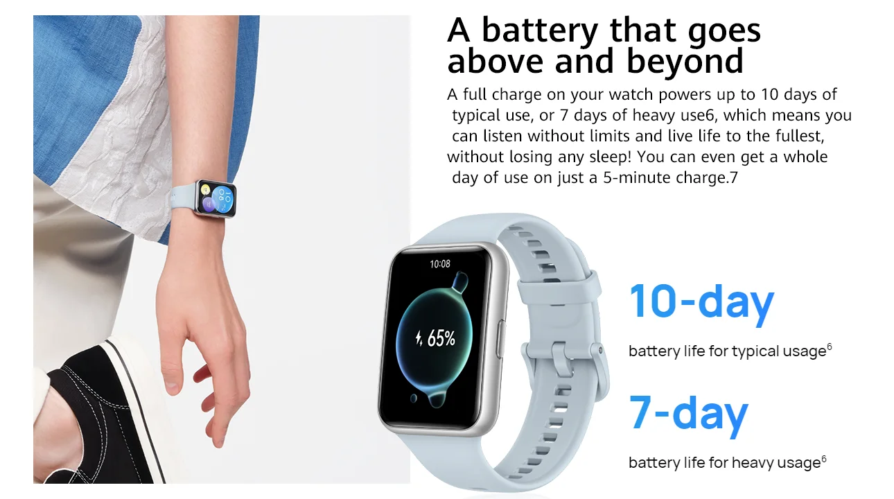 A full charge on your watch powers up to 10 days of typical use, or 7 days of heavy use6, which means you can listen without limits and live life to the fullest, without losing any sleep! You can even get a whole day of use on just a 5-minute charge.7