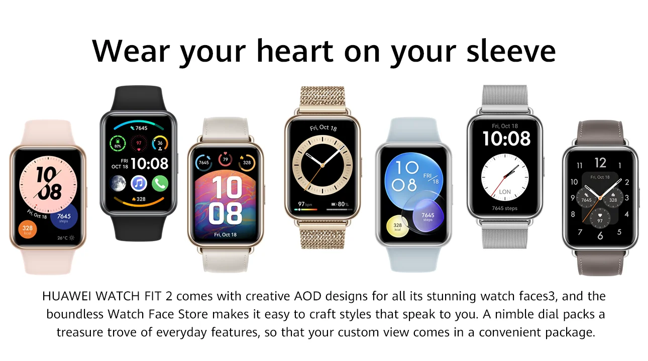 HUAWEI WATCH FIT 2 comes with creative AOD designs for all its stunning watch faces3, and the boundless Watch Face Store makes it easy to craft styles that speak to you. A nimble dial packs a treasure trove of everyday features, so that your custom view comes in a convenient package.