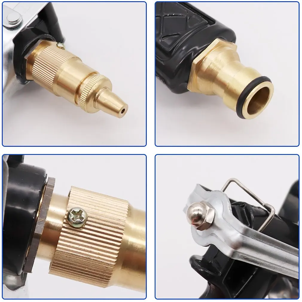 1. Металл, не легко сломать: Этот продукт использует полностью металлическую структуру. Он не будет поврежден при случайном падении, что лучше, чем пластиковое сопло. Наконечник сопла, быстроразъемный соединитель и Гайка изготовлены из латуни. Конечно, это устойчивая к ржавчине и долговечная насадка для шланга.