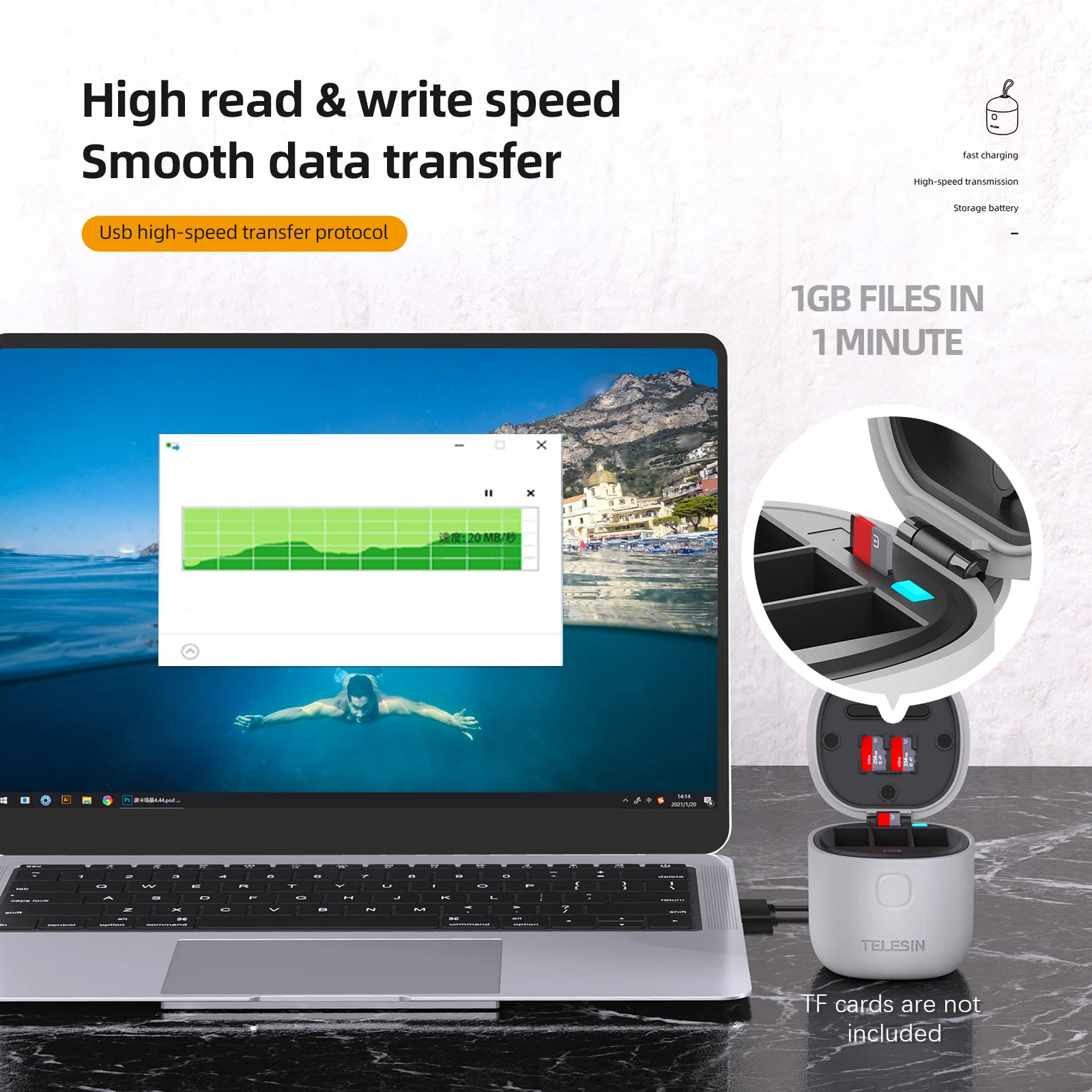 【 Зарядное устройство и коробка для хранения аккумуляторов с 3 слотамиВ качестве зарядного устройства, можно полностью зарядить до 3 батарей одновременно в течение примерно 2,5 часов; Как коробка для хранения, может хранить до 3 батарейки и 3 шт. TF-карты. С 1 слотом для карты памяти, обеспечивающим максимальную скорость чтения карт 20 МБ/с./с.