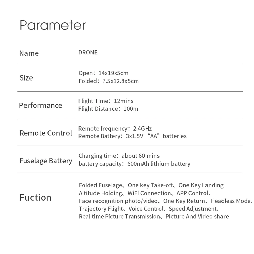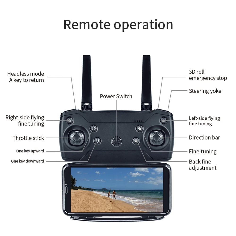 Функции: вверх/вниз, передний/задний, левый/правый поворот, боковой полет, светодиодный свет, Безголовый режим, автоматическое возвращение с одной кнопкой, режим удержания высоты, WiFi FPV
