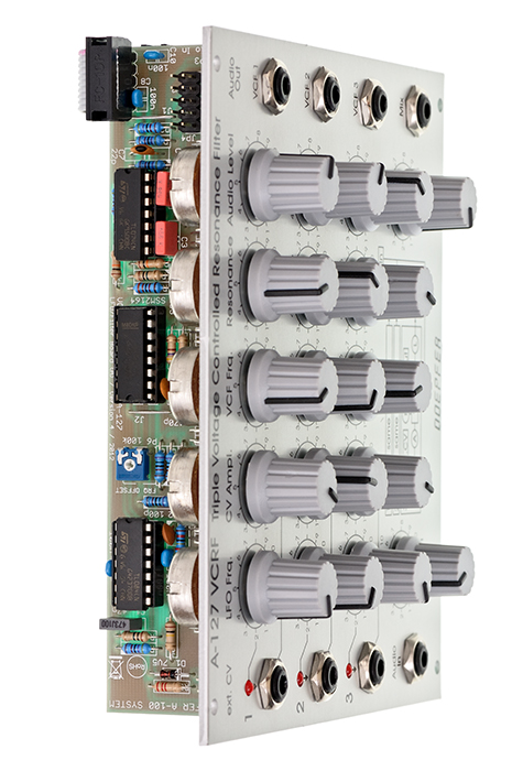 Doepfer A-127 VC Triple Resonance Filter - три параллельных, управляемых по напряжению, резонансных полосовых фильтра (каждый из которых переключается на Lowpass), каждый с собственным входом LFO или CV с аттенюатором. Отдельные выходы для каждого фильтра и общий выход. Очень хорошо подходит для живой фильтрации или в качестве формантного фильтра с модуляцией (в отличие от A-104). Каждая полоса пропускания имеет собственный треугольник LFO с регулируемой частотой и амплитудой, модулирующий частоту среза. Вместо внутреннего LFO можно использовать внешнее управляющее напряжение. В этом случае CV подается во внешнее гнездо CV (со встроенным переключателем для выключения сигнала LFO), а амплитудное управление LFO влияет на интенсивность модуляции CV.