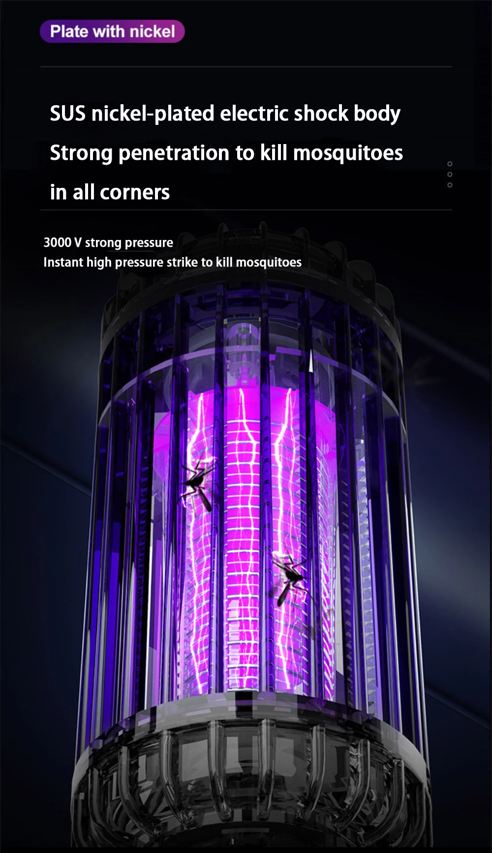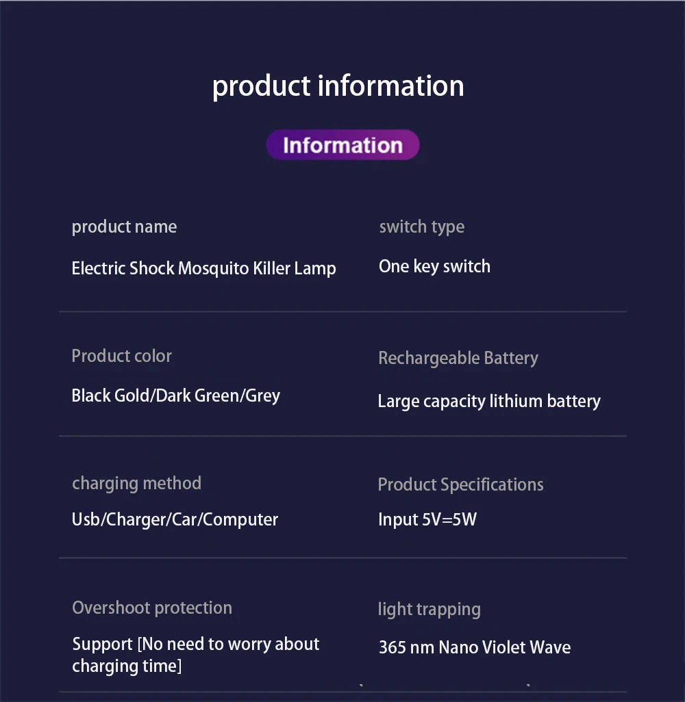 После полной зарядки, он может использоваться непрерывно в течение 8 часов, 365nm светильник может эффективно убить комаров, и срок службы батареи больше.