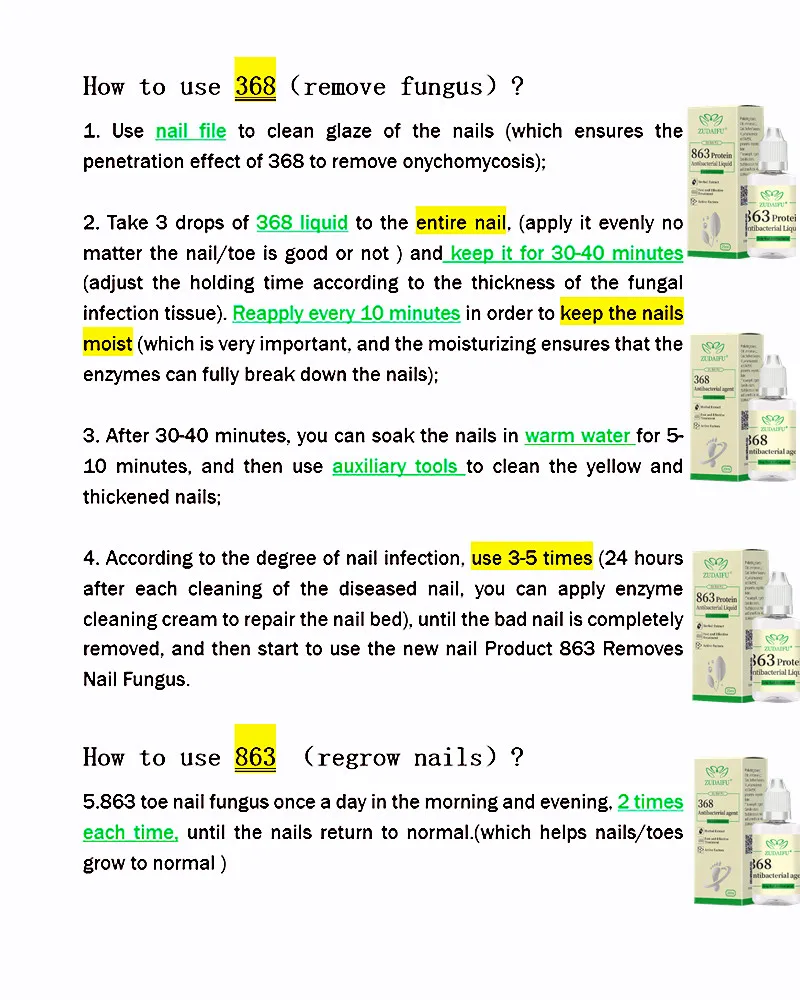 4. В зависимости от степени инфекции ногтей, используйте 3-5 раз (24 часа после каждой очистки больного ногтя, вы можете применить ферментный очищающий крем для ремонта ногтевой койки), до полного удаления плохого ногтя, а затем начать использовать новый продукт для ногтей 863 удаляет грибок ногтя.