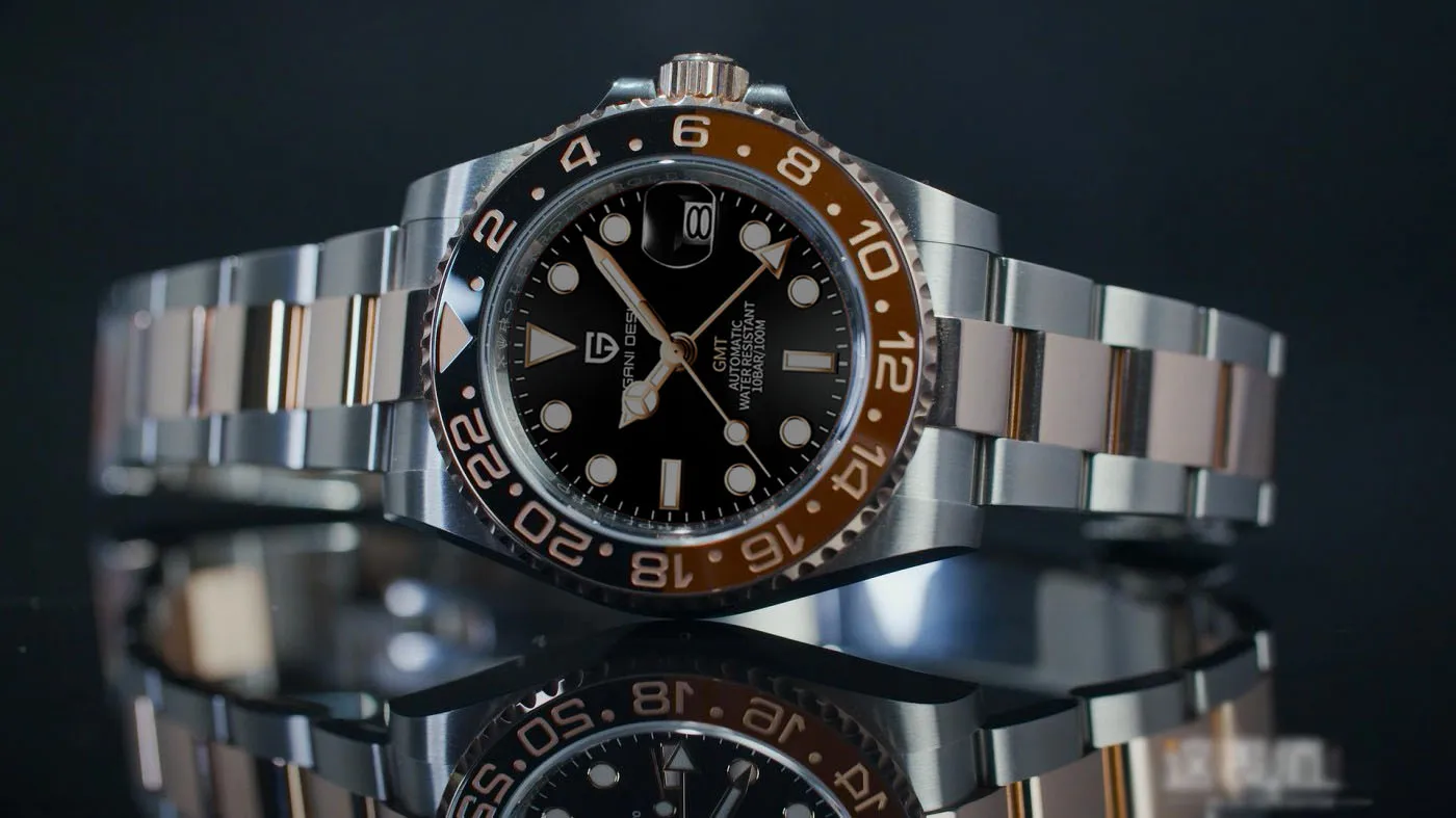 Pagani Design GMT multiple time zones MEN'S SELF WINDING WATCHES: watch is equipped with a super luminous dial, a sea-water resistant stainless steel case and band, as well as a rotating ceramic bezel with marking at 60 minutes; Synthetic sapphire crystal curved mirror, has a very high light transmission, the hardness of the sapphire is the second after the diamond, making your watch more durable and resistant to scratches and refraction.Ceramic bezel design(note: "black-red" and "blue-red" non-ceramic bezels)