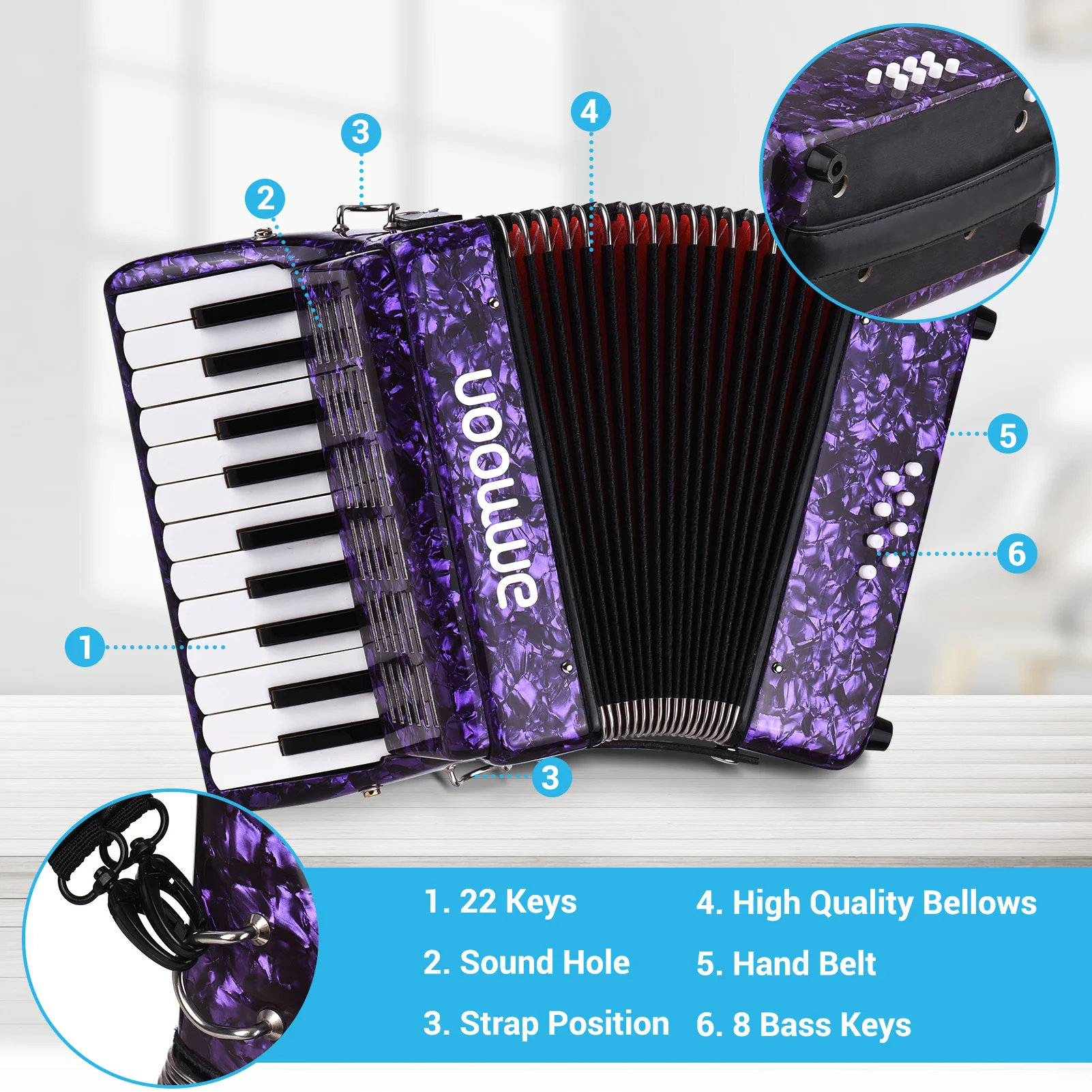 Аккордеон, компактный и легкий, поставляется с 2 регулируемыми лямками, для легкой игры.