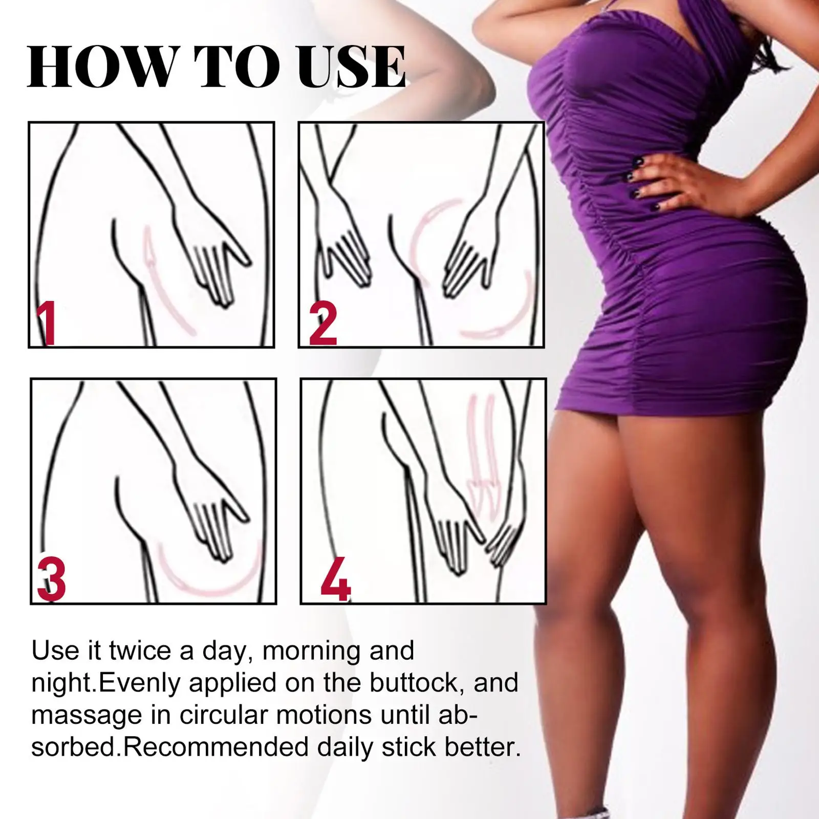 Используйте его два раза в день, утром и ночью. Равномерно наносите на ягодицу и массируйте круговыми движениями до АБ-сорбирования. Рекомендуется использовать ежедневную палку лучше.