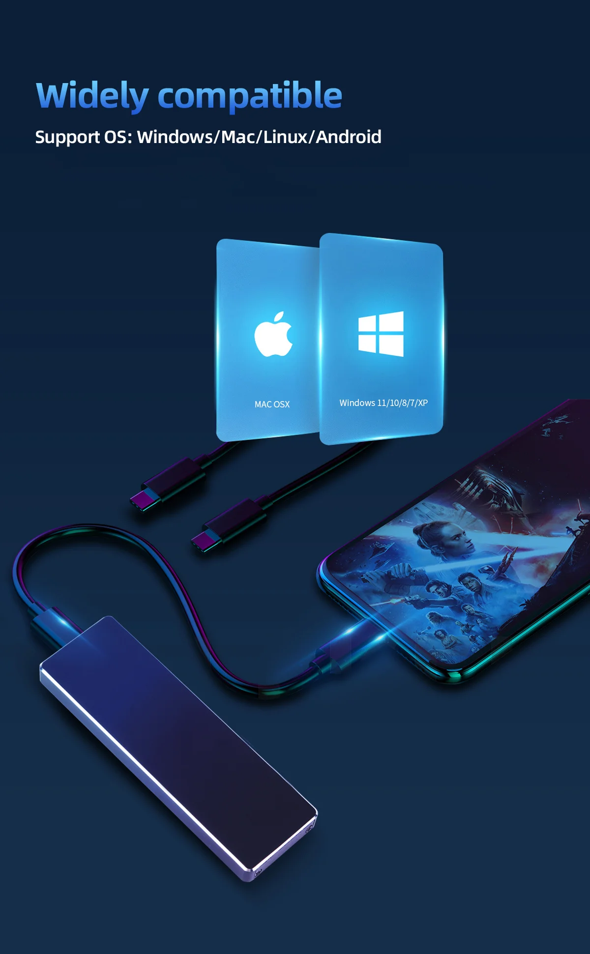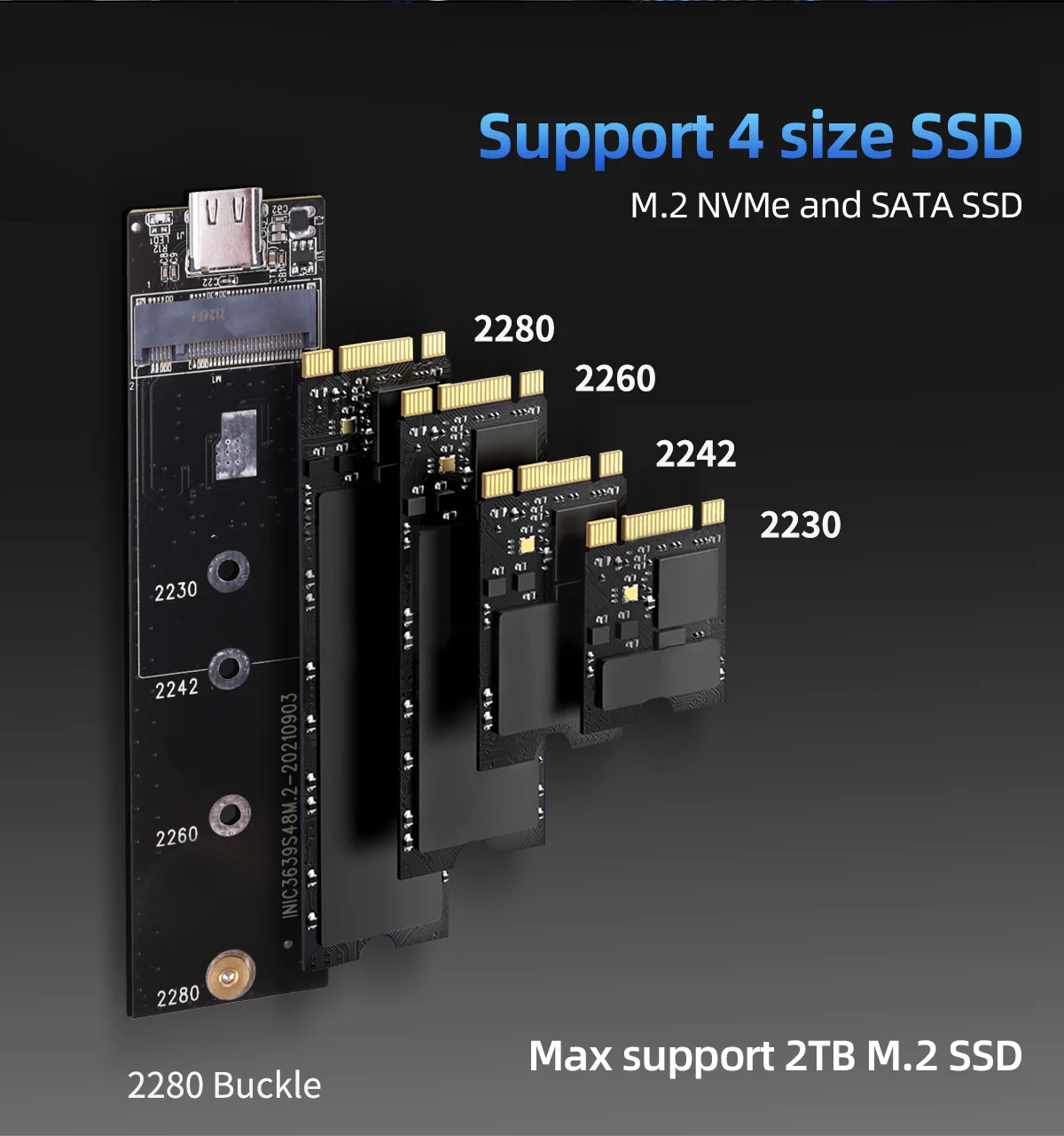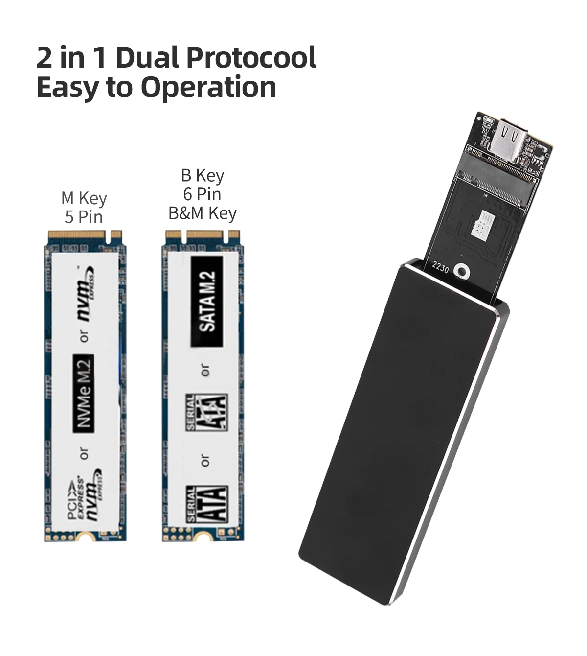 Поддерживает NVME PCIe M-Key/ M + B-Key SSD и NGFF SATA протокол M + B-Key SSD, с кабелем USB Type C 26 см для Type C, И 26 см USB Type A to Type C кабель, опционально.