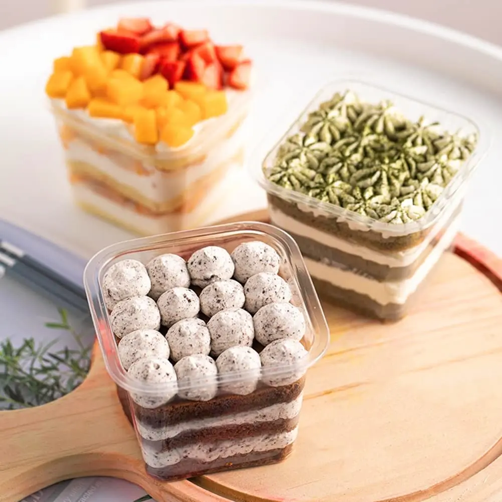 Удобно использовать:Эти квадратные пластиковые стаканчики с крышками могут защитить десерты от окрашивания и сохранить их свежими, также удобно снимать
