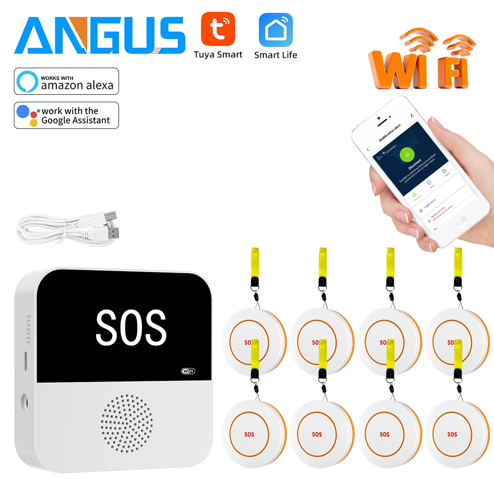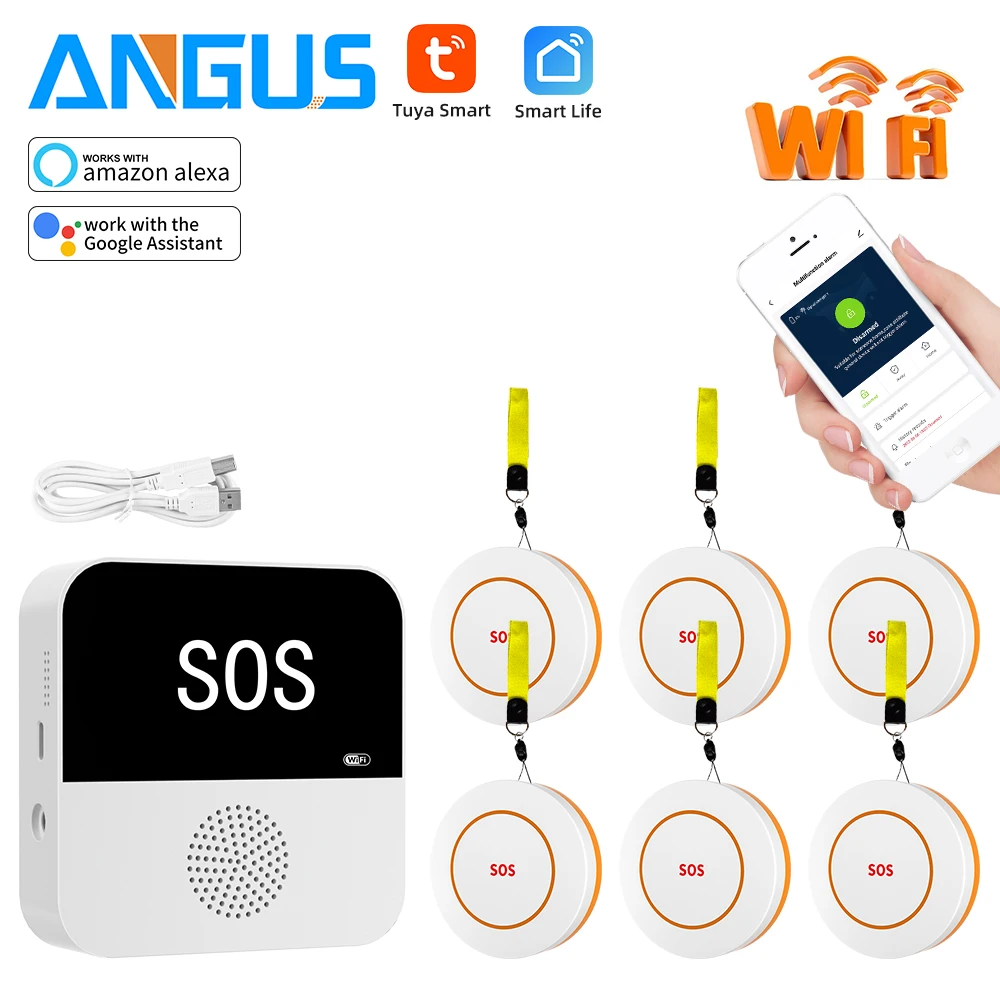 Angus Tuya Wifi pager может быть подключен к телефону для реализации удаленного push, заботиться о молодых и старых дома в любое время, в любом месте. При возникновении опасности, пожилым людям можно нажать передатчик SOS и сигнал будет отправлен на телефон и приемник.
