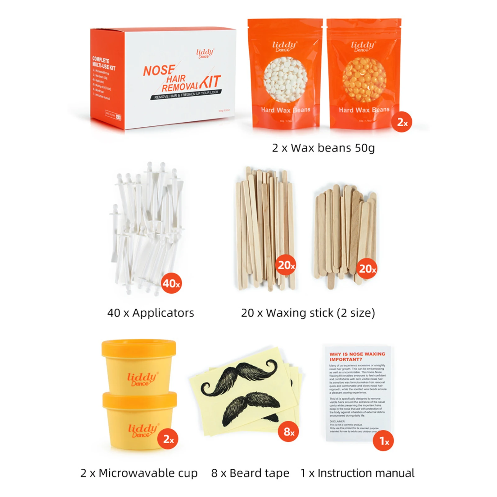 40 wax sticks, 2 bag wax beans, 8 mustache stickers, 2 microwavable cup and 40 nasal wax stick are included.