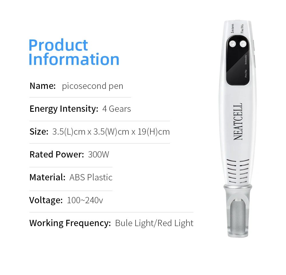 -Мощность и эффект синий светильник picosecond pen более сильны. Требуется более профессиональная работа. Пожалуйста, начните с самой низкой частоты, затем медленно Настройте на подходящий уровень.