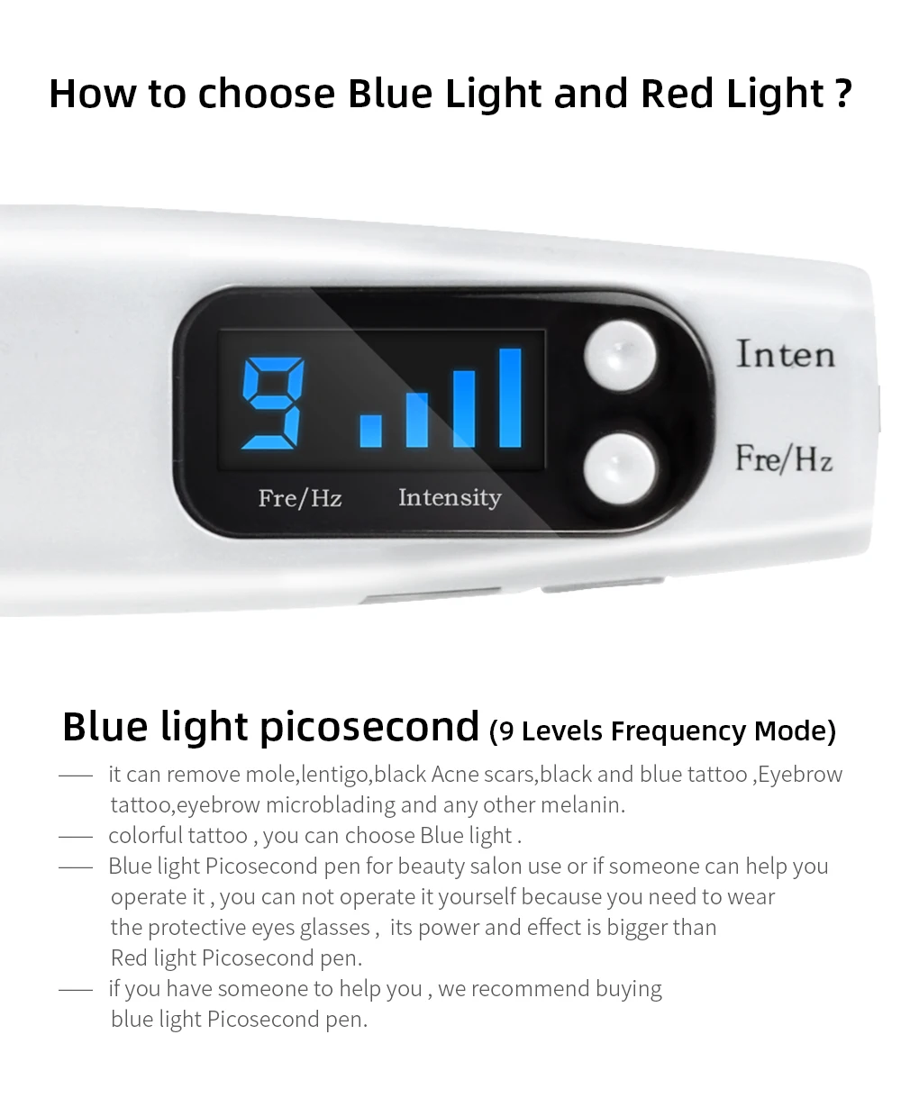 -Синий светильник Picosecond pen для использования в салонах красоты или если кто-то может помочь вам управлять им, вы не можете управлять им самостоятельно, потому что вам нужно носить защитные очки для глаз, его мощность и эффект больше, чем красный светильник Picosecond pen.
