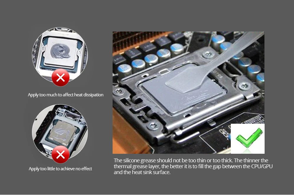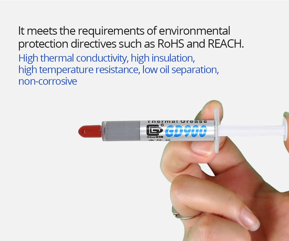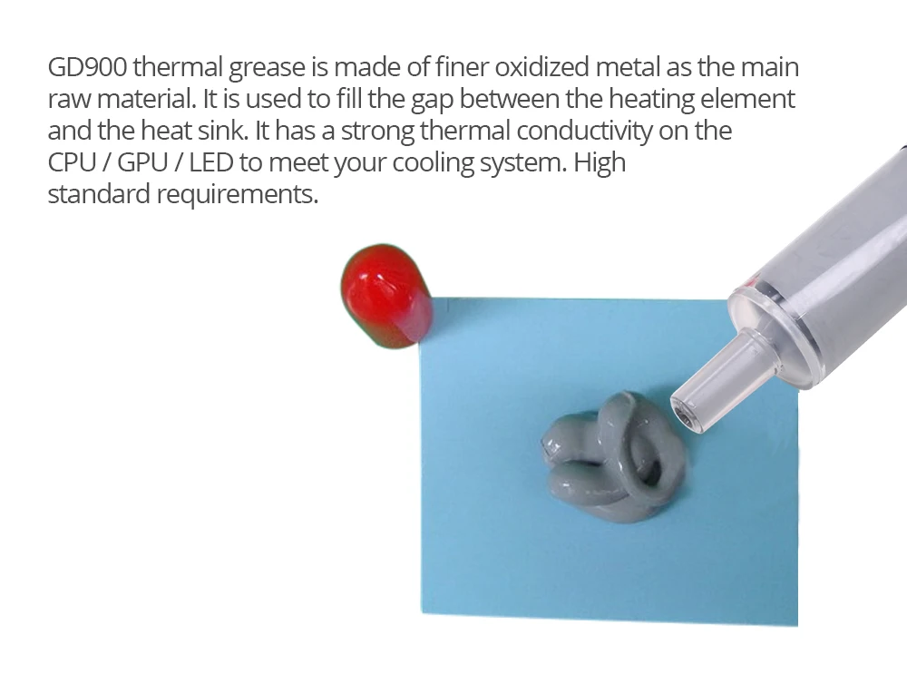 3:GD900 thermal grease is made of finer oxidized metal as the main raw material. It is used to fill the gap between the heating element and the heat sink. It has a strong thermal conductivity on the CPU/ GPU/LED to meet your cooling system. High standard requirements