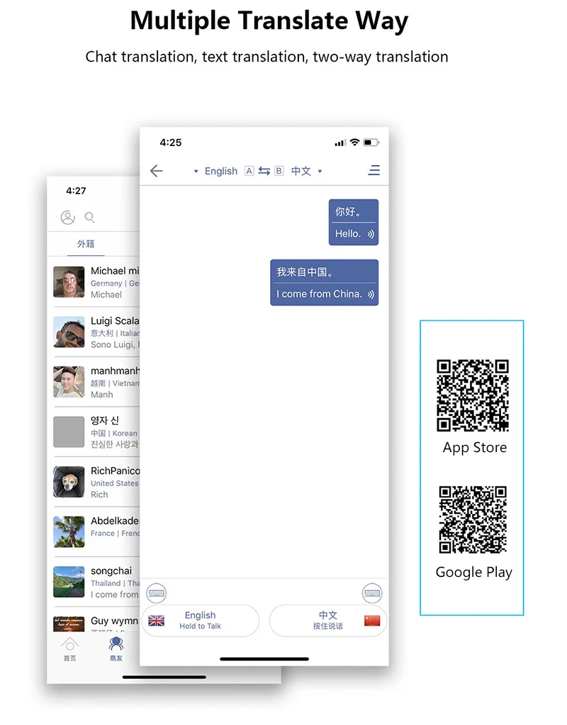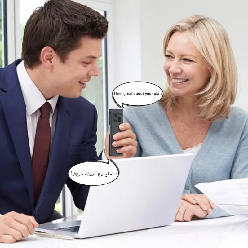 -Двусторонний Интерком в режиме реального времени: он может использоваться для общения лицом к лицу и решения препятствий для общения. Дает вам наиболее подходящий результат перевода в режиме реального времени, быстрый ответ за считанные секунды.