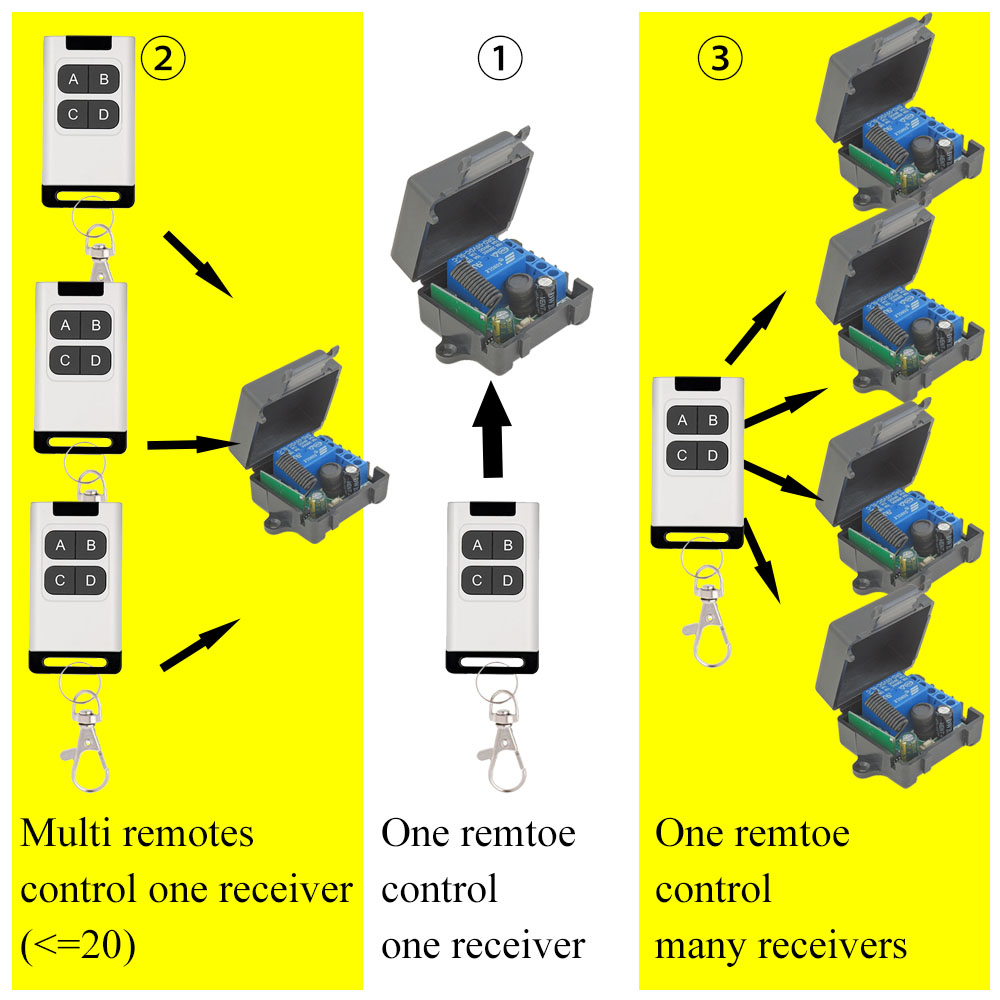 Один приемник может использовать почти 20 пультов дистанционного управления. Но приемник может поймать только один сигнал один раз. Поэтому, если вы одновременно нажмете несколько кнопок дистанционного управления, ответа не будет.