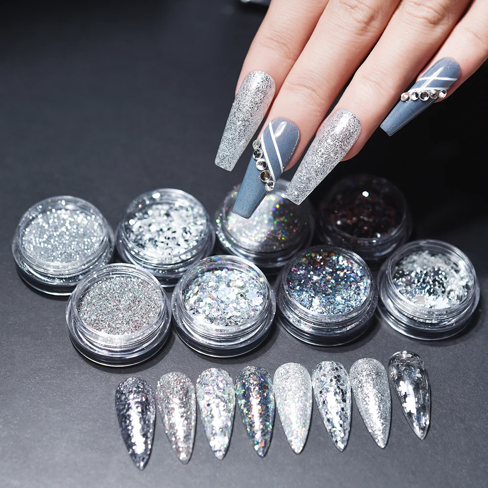 8 Boxes: Holographic Nails Powder/ Glitters/ Sequins/Snowflake/Hexagon Glitter. Fashionable and beautiful colors.