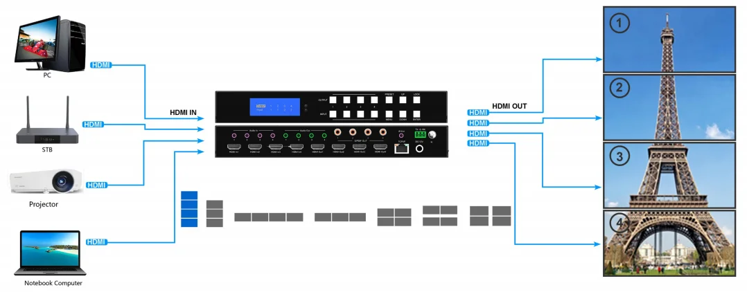 4x HDMI входы, которые могут быть независимо направлены на HDMI выходы. Нет задержки переключения или потери изображения во время переходов.