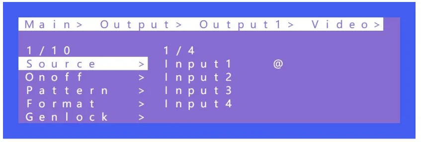 Главное меню разделено на 5 модулей, которые являются выходами, входами, предустановленными настройками, конфигурациями и информацией. Каждый модуль имеет несколько подменю, которые должны быть настроены соответственно.