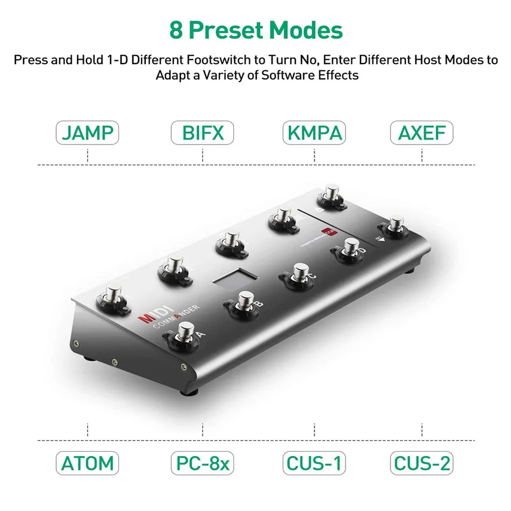 MIDI Commander-это полнофункциональное устройство MIDI контроллер для ног, который дает гитариста удивительная гибкость и контроль. Он совместим со всеми миди-управляемых устройств, таких как аудио-интерфейс, гитарный усилитель или стеллажи для выставки товаров, которая имеет миди-порт. Десять ножные выключатели и два выражение педаль вход удовлетворить потребности самого взыскательного гитариста. MIDI Commander совместима со всеми миди-управляемых устройств, а также обеспечивает гибкость, простота в использовании, И прочный надежность, необходимые для того, чтобы удовлетворить потребности самого взыскательного профессиональных игроков.