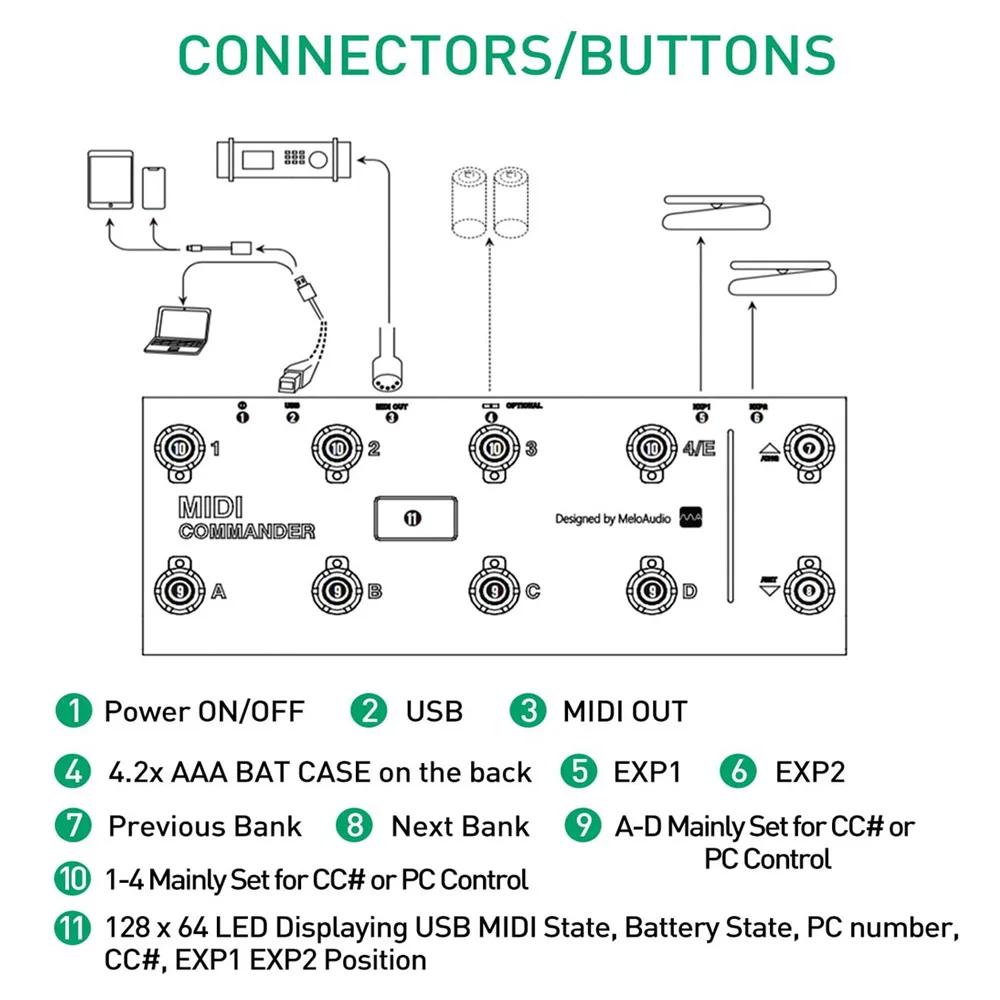 MIDI Commander дать вам силу и гибкость для того чтобы контролировать каких-либо инструментов с миди разъем. MIDI Commander также поддерживает USB-MIDI конвертер функция. Так что вы можете использовать его для того чтобы контролировать большую часть программное обеспечение эффекты/приложения на Windows, В настоящее время Mac OS и iOS. К нему можно подключить до двух выражение педали поддержки «увеличить громкость»/«Вах в одно и то же время. Десять бортовой металлическая ножка переключателей и оптимизированный режим хоста предназначены для легкого использования без каких-либо дополнительных настроек. Один достаточно большой OLED экран включает в себя всю необходимую информацию и может быть прочитана с любого ракурса в темное время суток или дневной свет. Трехсторонний блок питания (две батарейки ААА, USB адаптера переменного тока, или через OTG кабель). Это очень компактный и легкий мужской кошелек. Но прочная конструкция обеспечивают пригоден к эксплуатации надежности.