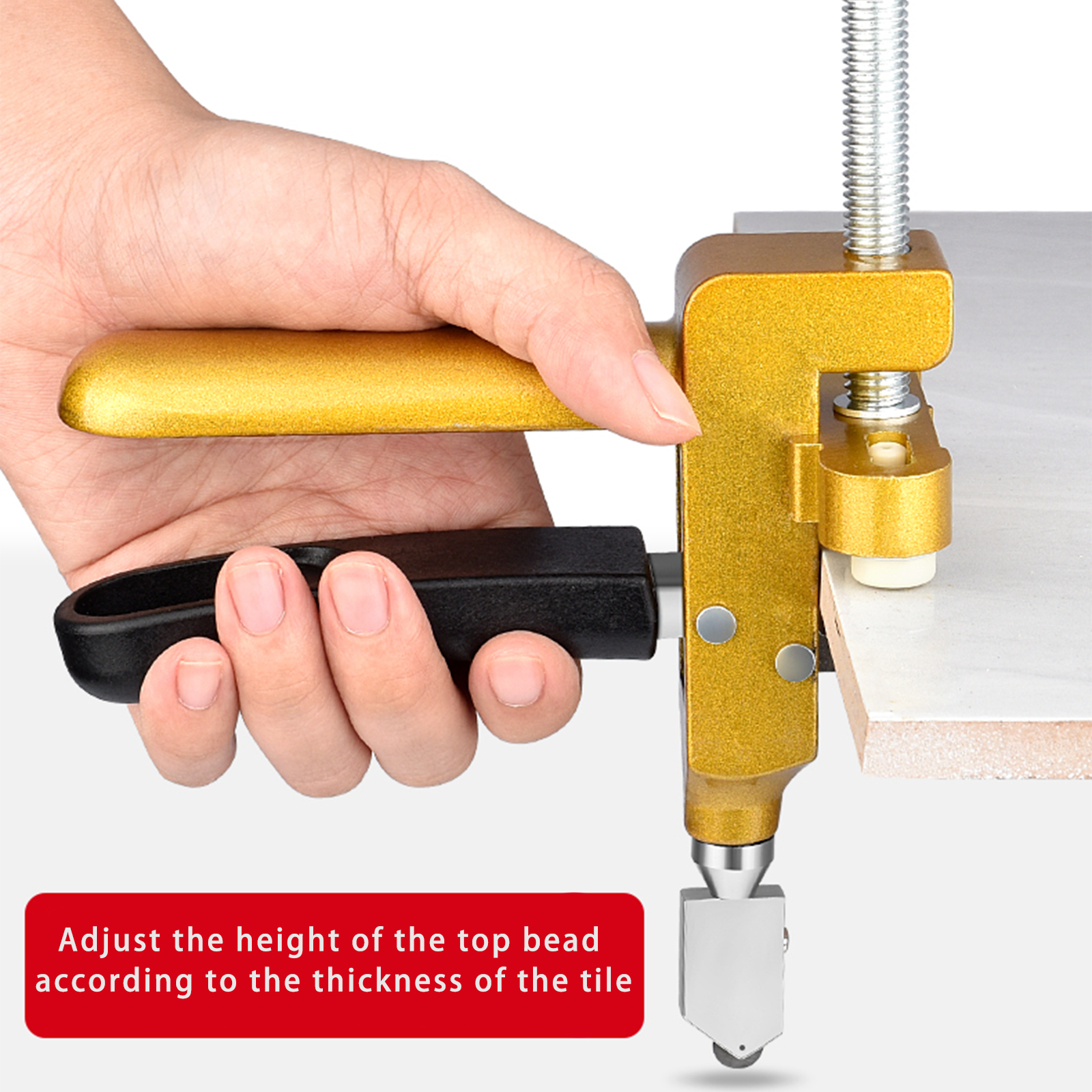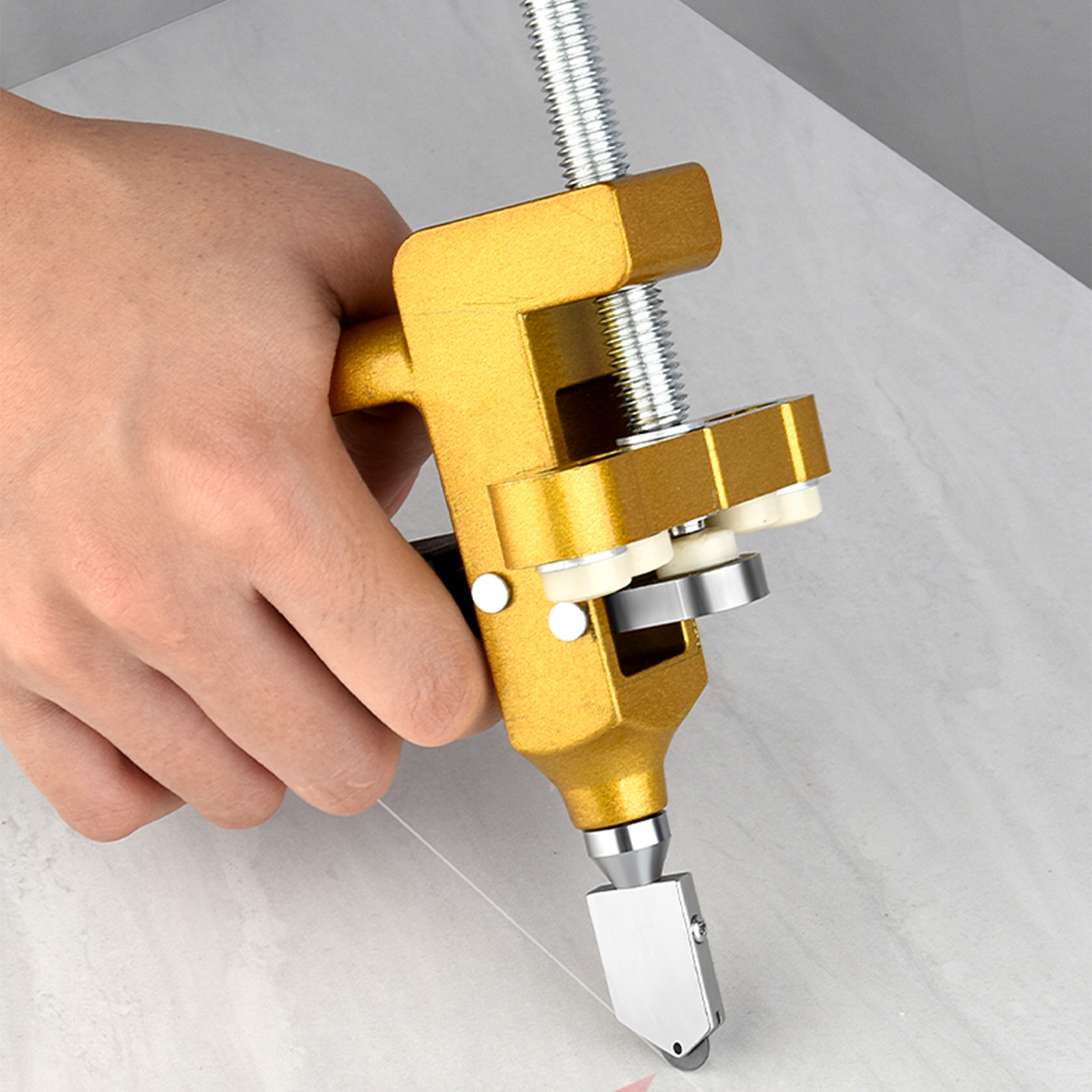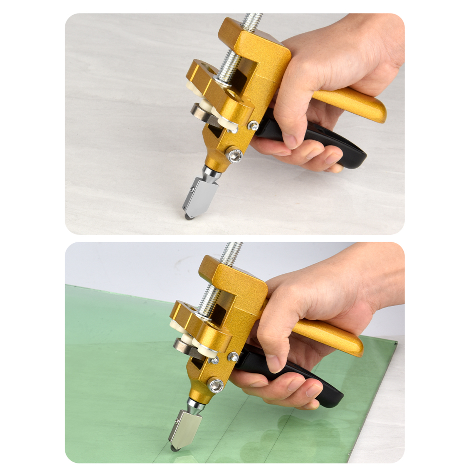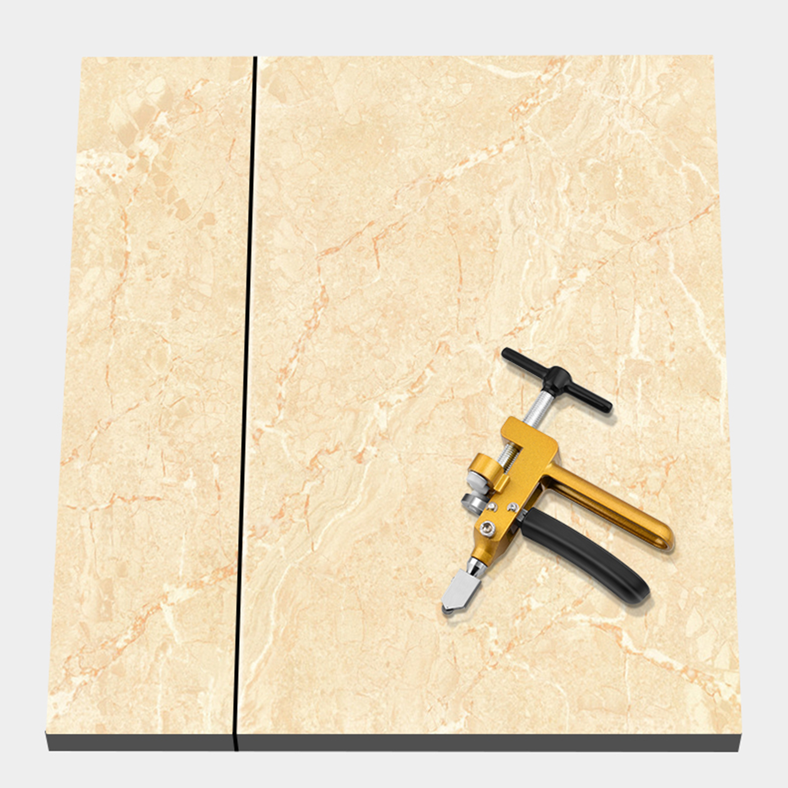 3. Простое управление: Оценка плитки/стекла. Прижмите плитку/стекло. Поверните поворотную рукоятку. Советы: Держите даже силу при резке плитки/стекла. Выравнивает забитую линию с прямой белой линией на корпусе резака для точного разрыва.