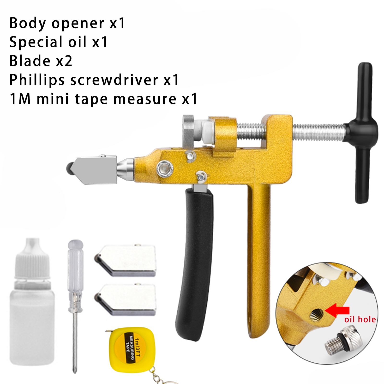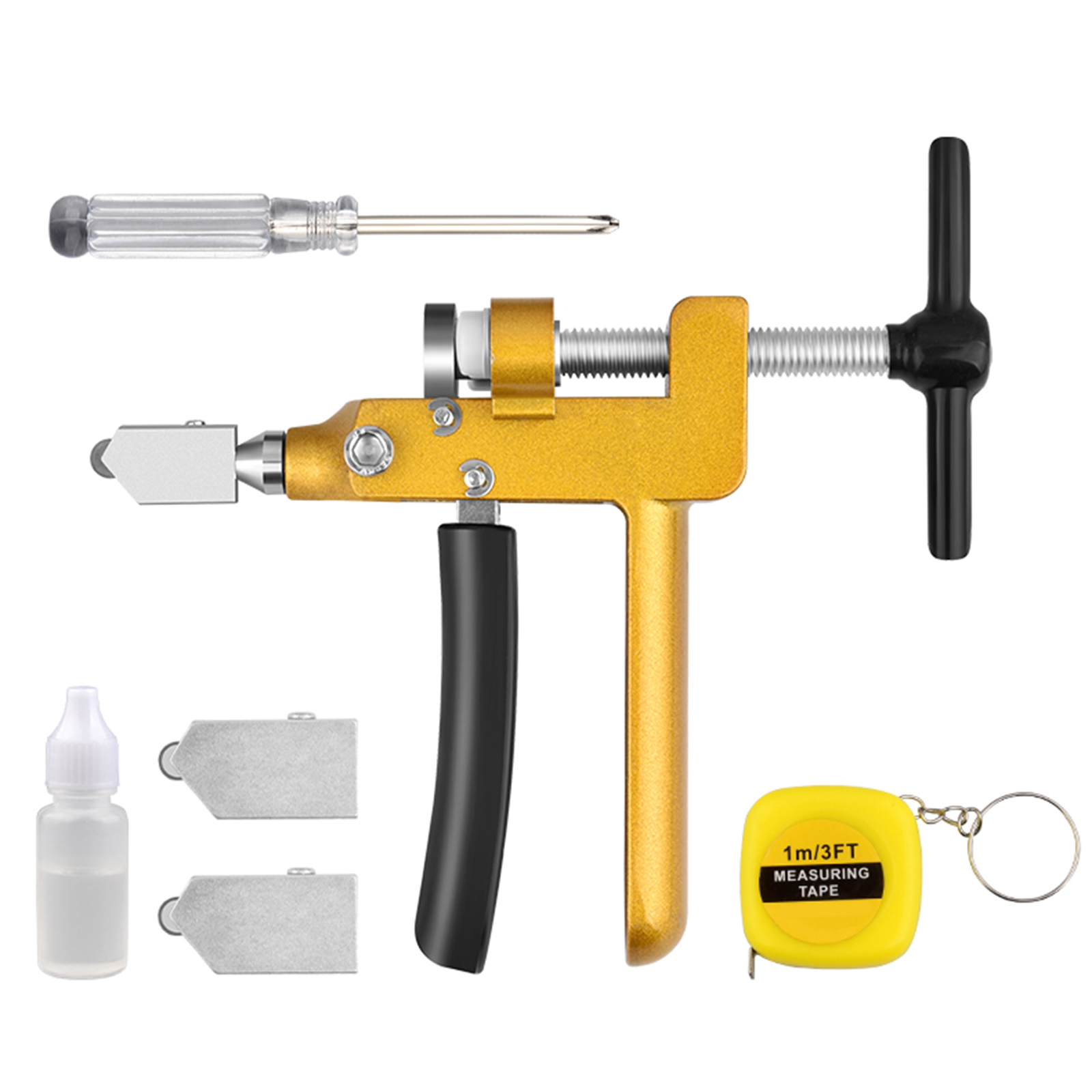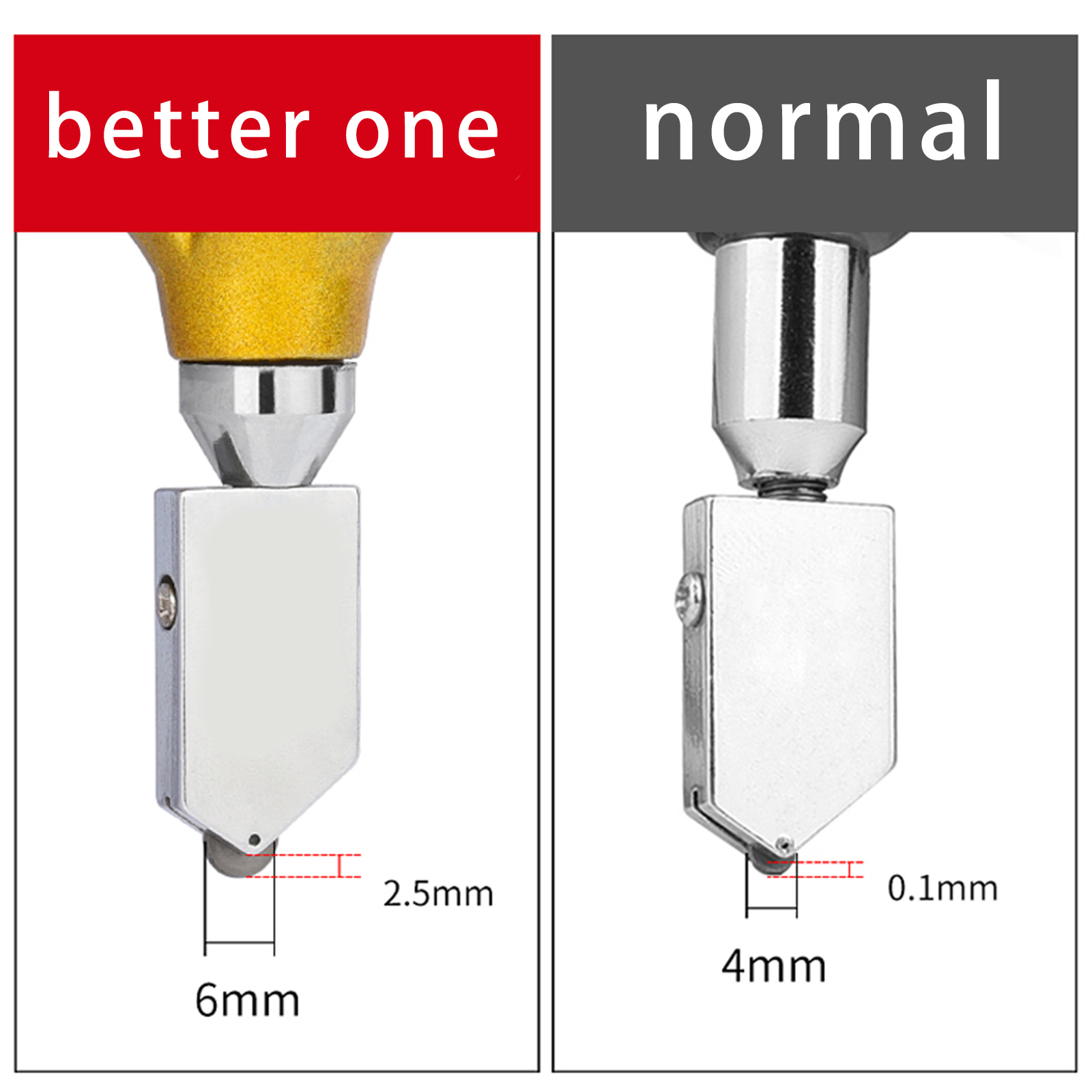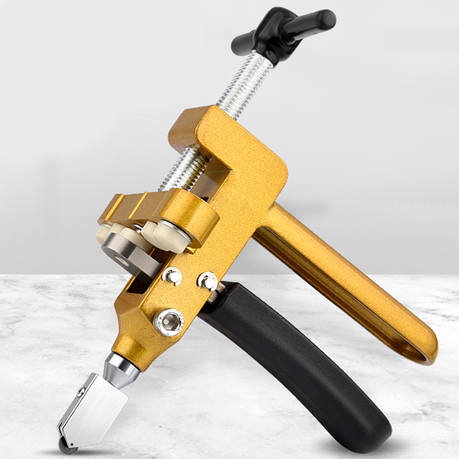 3. Простое управление: Оценка плитки/стекла. Прижмите плитку/стекло. Поверните поворотную рукоятку. Советы: Держите даже силу при резке плитки/стекла. Выравнивает забитую линию с прямой белой линией на корпусе резака для точного разрыва.