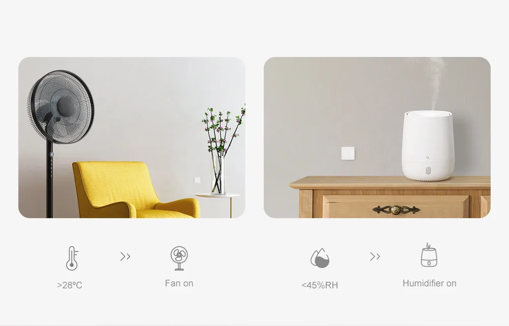 Желаю вашему дому всегда поддерживать благоприятную температуру и влажность? Включите интеллектуальную сцену, чтобы вентилятор автоматически включался, когда комнатная температура достигает 28 ℃, и увлажнитель автоматически включается, когда влажность в помещении ниже 45% RH.