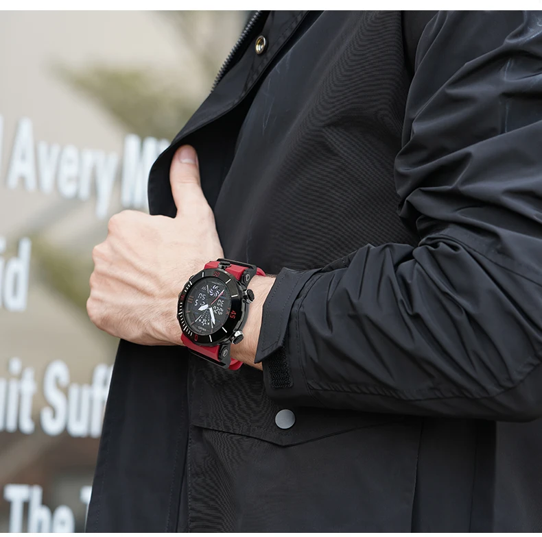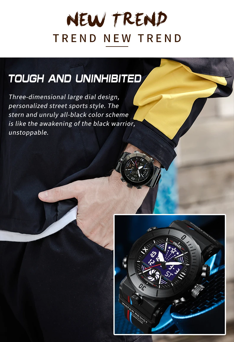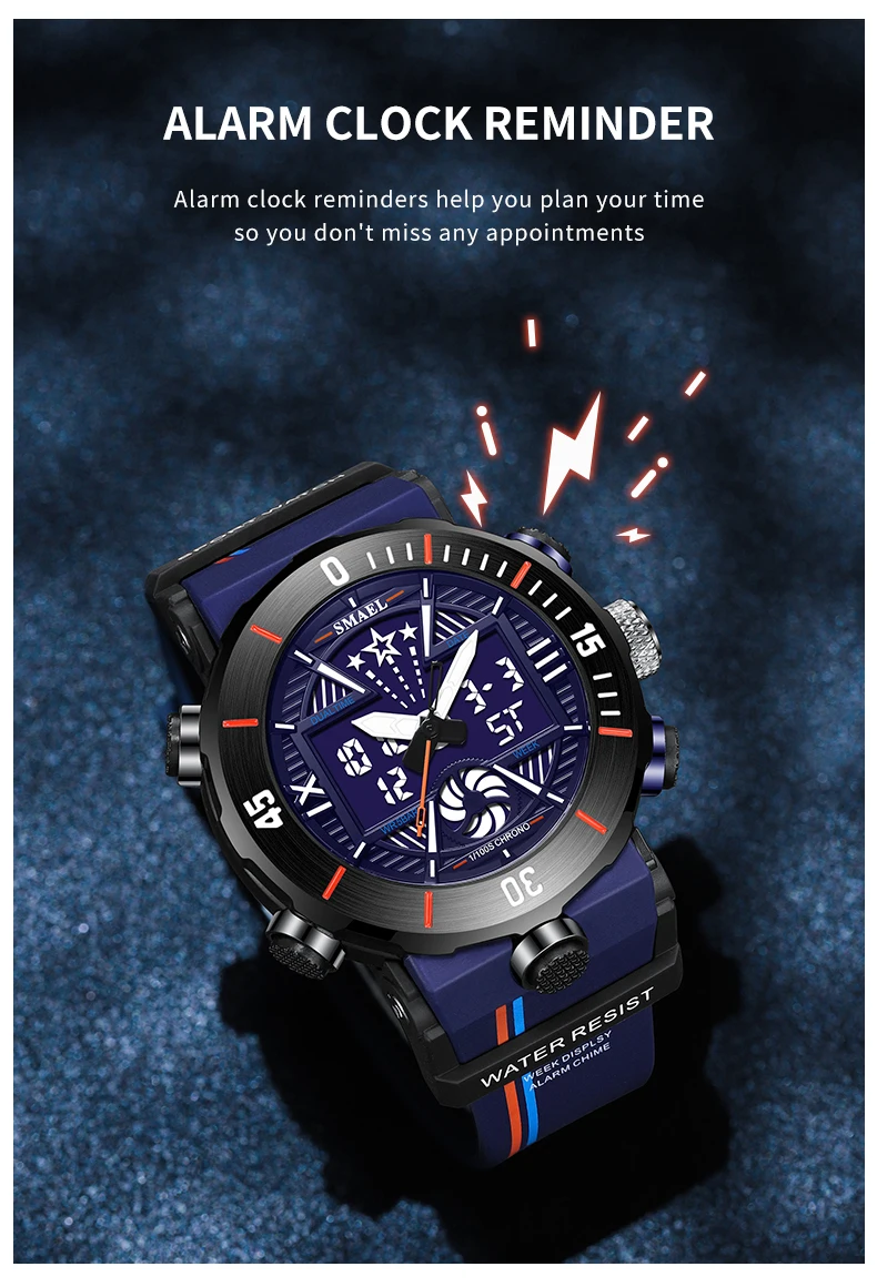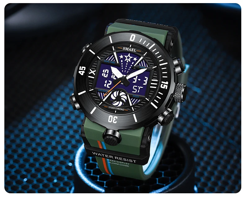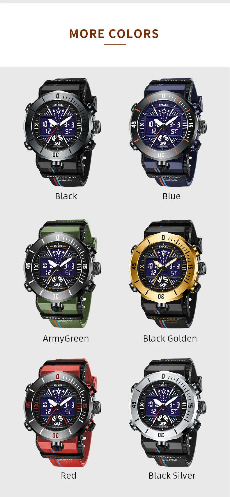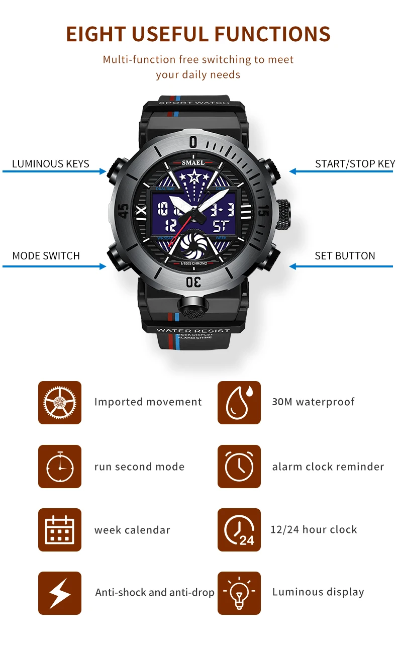 1. Brand: SMAEL2. Dual time shows with LED backlight function3. 50M Water Resistant4. Type: Men Sports Watches5. Movement: Japan Original Digital Movement6. There are 6 colors for selection8. Band Width: (approx) 2.2cm9. Dial Diameter: (approx) 5.0cm10. Strap Material: Strong PU11. Case Material: Strong Rubber + High Strength Hardened Glass12. Clasp: Buckle13. Showing precise time14. It is good gift for someone specialNote: we suggest you not wear it when swim .but if you go to swim or dive , pls don't press any button underwater!Components Included:-1 x Genuine SMAEL Watch-1 x Use Manual