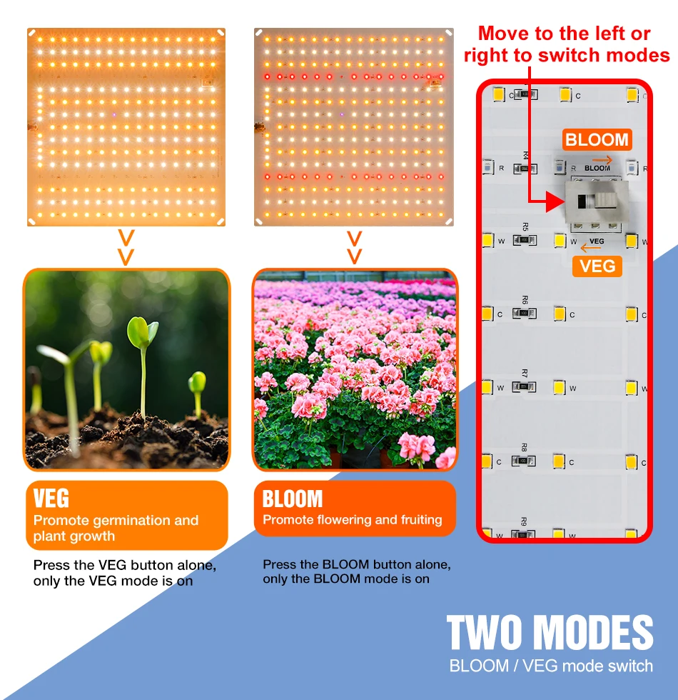 * Два режима работы, режим VEG показывает теплый белый, белый, УФ, который способствует прорастанию семян и росту растений; Режим цветения показывает теплый белый, белый, красный, ИК, УФ, который способствует цветению и плодоношению.