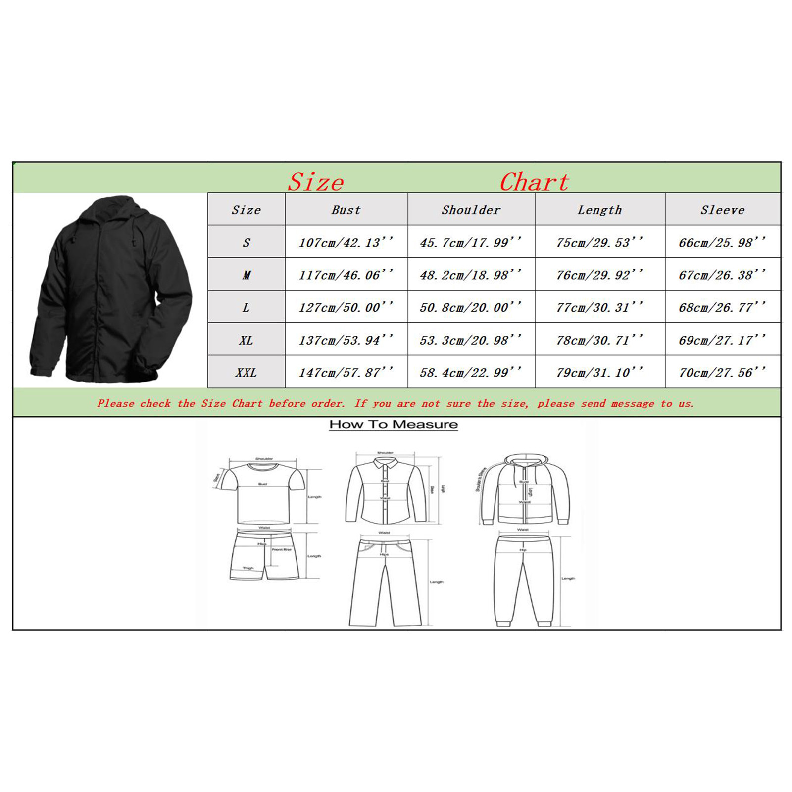 Размеры Бюст Плечо Длина Рукав S 107 см/42,13'' 45,7 см/17,99'' 75 см/29,53'' 66 см/25,98'' М 117 см/46,06'' 48,2 см/18,98'' 76 см/29,92'' 67 см/26,38'' L 127 см/50,00'' 50,8 см/20,00'' 77 см/30,31'' 68 см/26,77'' XL 137 см/53,94'' 53,3 см/20,98'' 78 см/30,71'' 69 см/27,17'' XXL 147 см/57,87'' 58,4 см/22,99'' 79 см/31,10'' 70 см/27,56'' Размер: S Обхват груди: 107 см/42,13 дюйма Плечо: 45,7 см/17,99'' Длина: 75 см/29,53'' Рукав: 66 см/25,98 дюйма Размер: M Обхват груди: 117 см/46,06 дюйма Плечо: 48,2 см/18,98'' Длина: 76 см/29,92'' Рукав: 67 см/26,38 дюйма Размер: L Бюст: 127 см/50,00'' Плечо: 50,8 см/20,00'' Длина: 77 см/30,31 дюйма Рукав: 68 см/26,77 дюйма Размер: XL Бюст: 137 см/53,94'' Плечо: 53,3 см/20,98'' Длина: 78 см/30,71 дюйма Рукав: 69 см/27,17 дюйма Размер: XXL Бюст: 147 см/57,87'' Плечо: 58,4 см/22,99'' Длина: 79 см/31,10'' Рукав: 70 см/27,56 дюйма