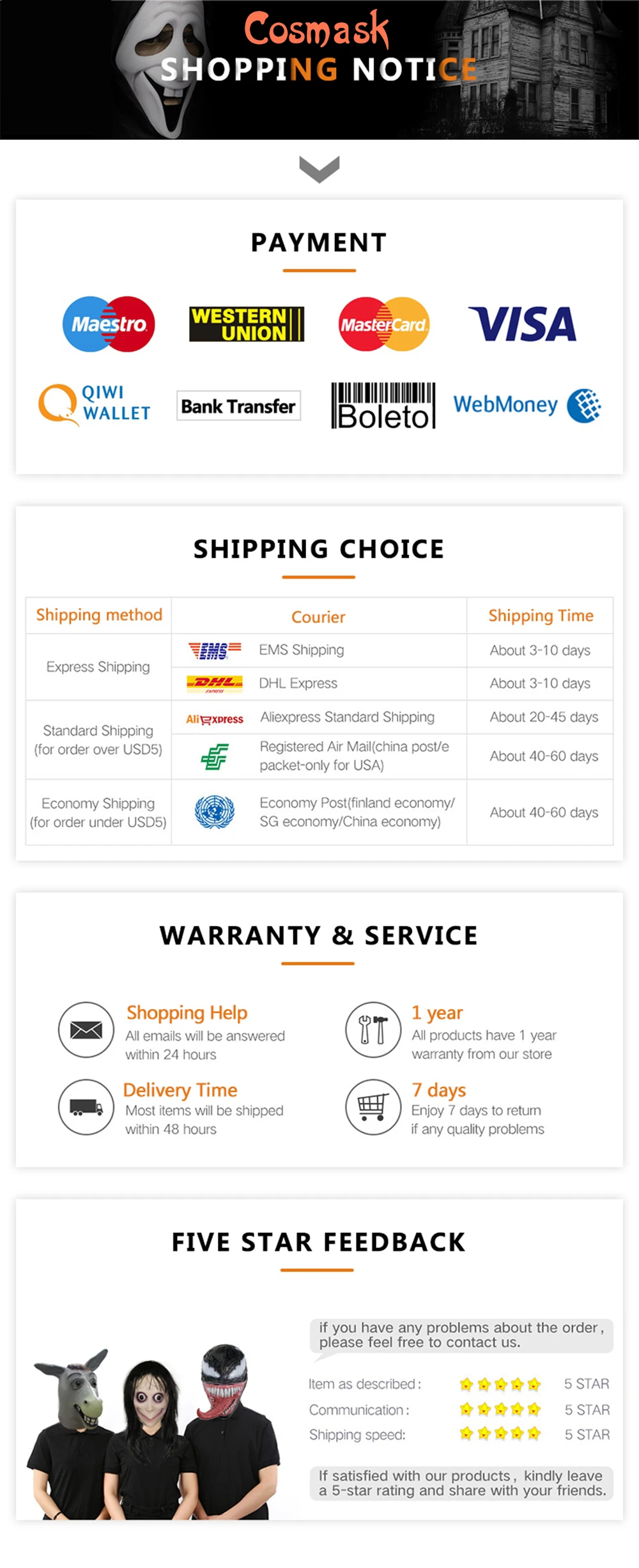 1. Пожалуйста, выберите способ доставки перед заказом. Мы вышлем товары в течение 5 рабочих дней, как только ваш платеж будет полностью проверен.