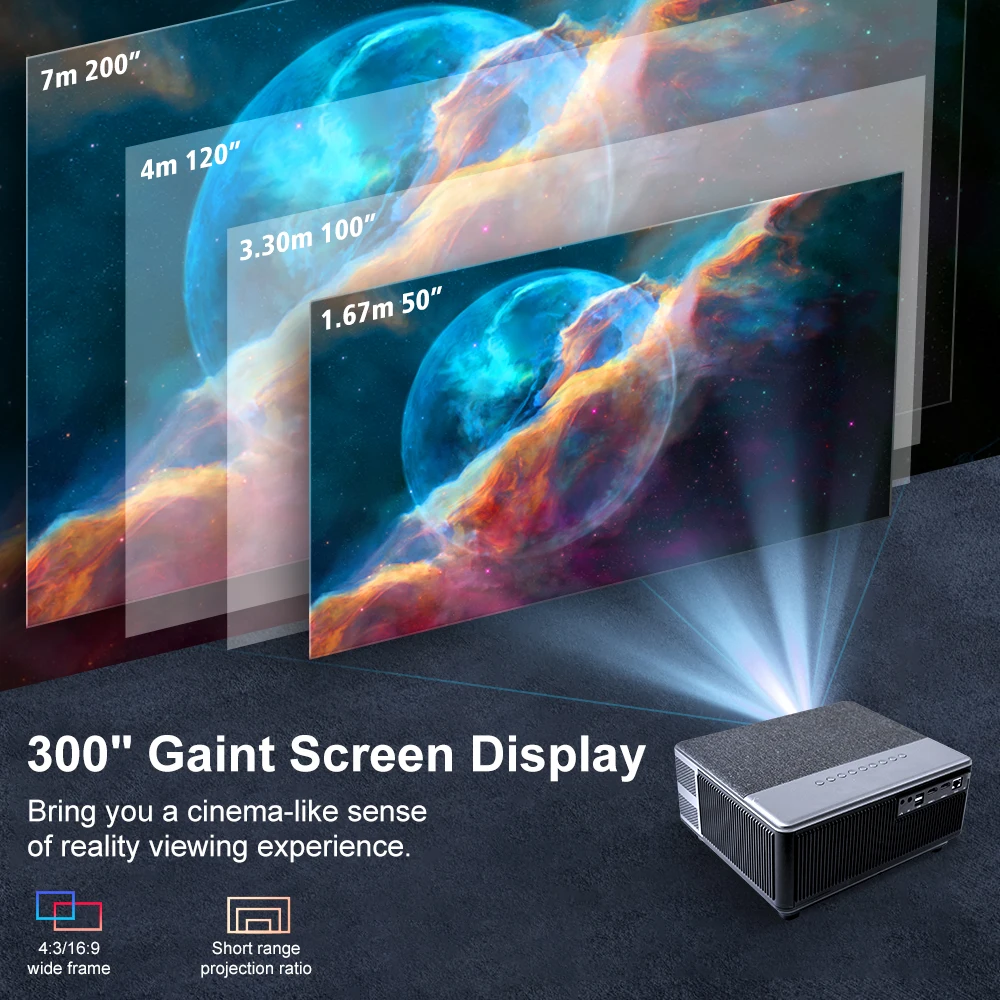 Этот 2K 4K проектор Поддержка проекционное расстояние от 1,5 до 8 метров для того чтобы достигнуть 50 до 300 "Размер проецируемого изображения.