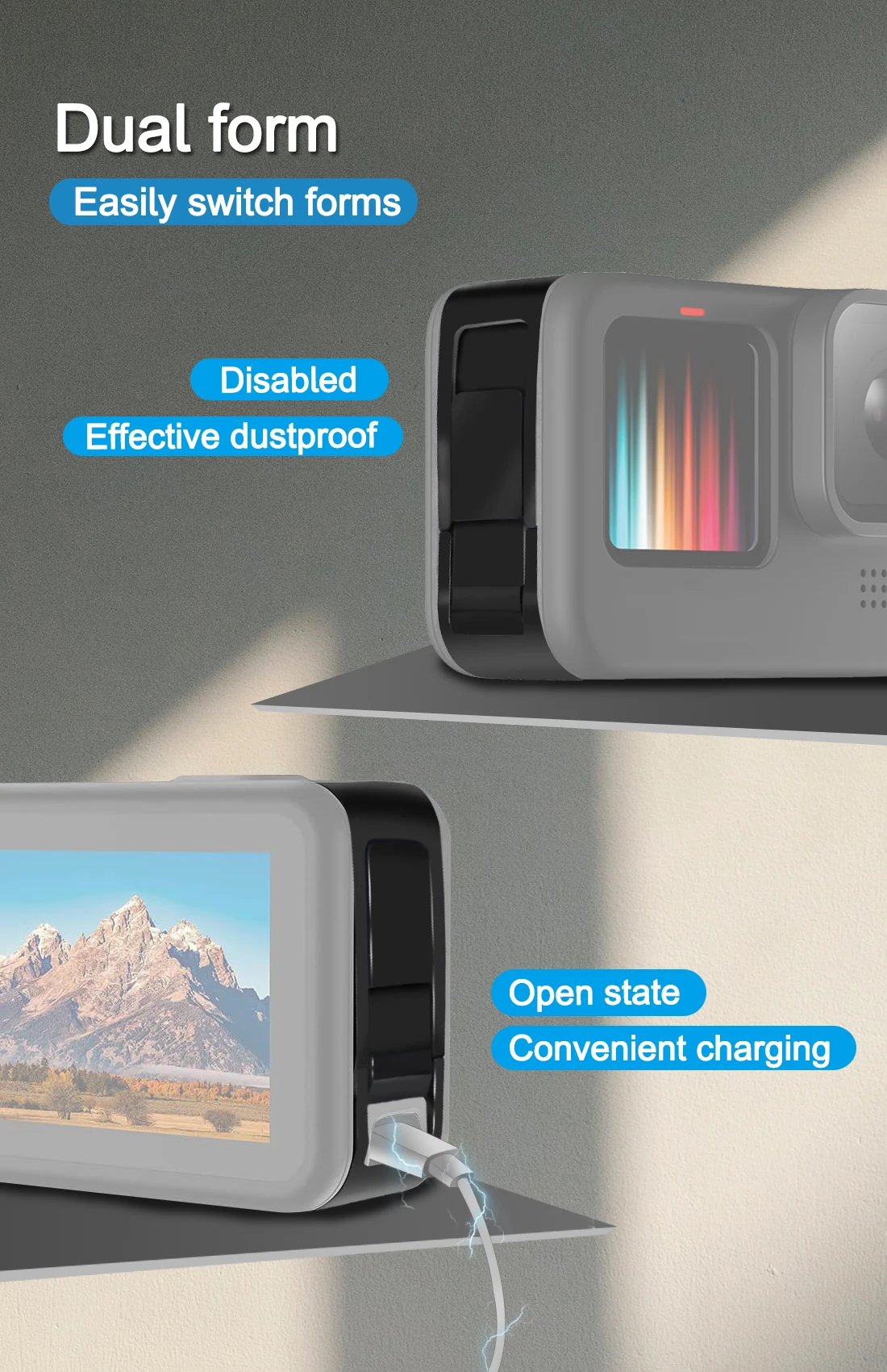 4. Уникальный дизайн окна, когда вам не нужно заряжать камеру, вам не нужно заменять оригинальную боковую крышку, просто закройте окно, Пыленепроницаемость и защита от брызг! Лучше Защитите камеру!