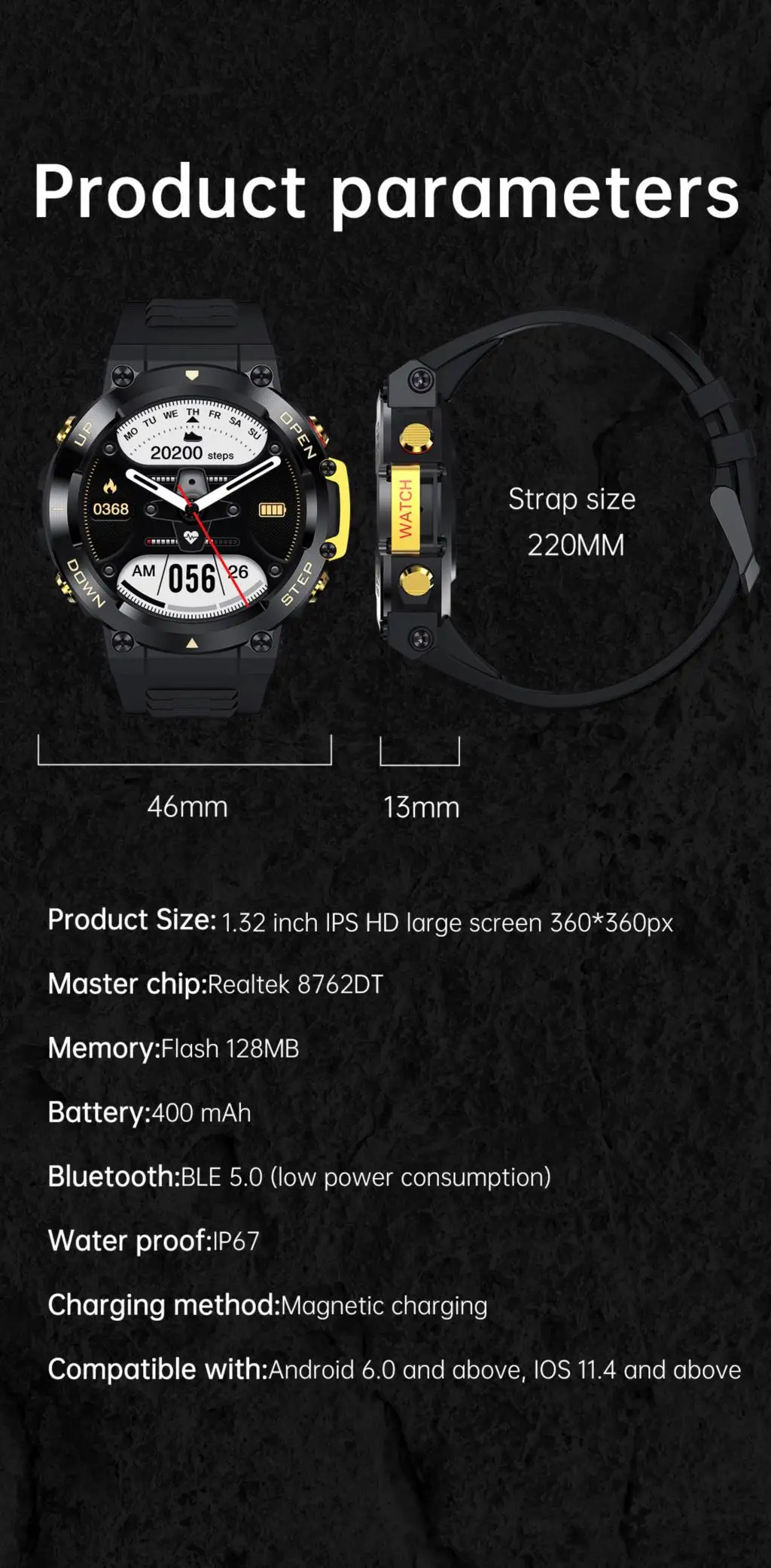 Размер умных часов: 46 мм * 46 мм * 13 (мм).
