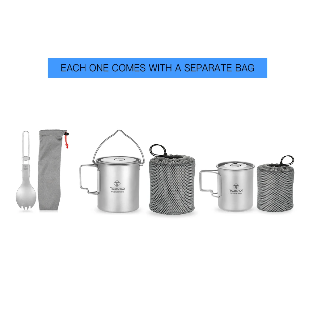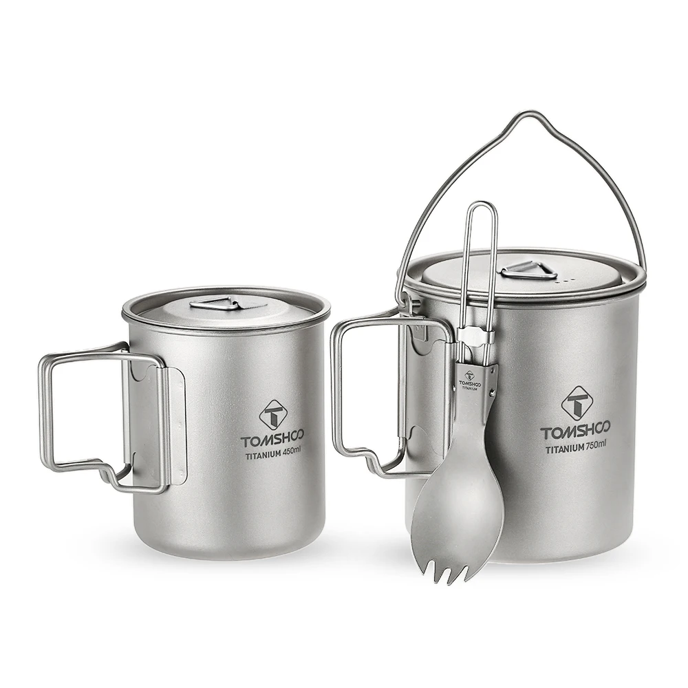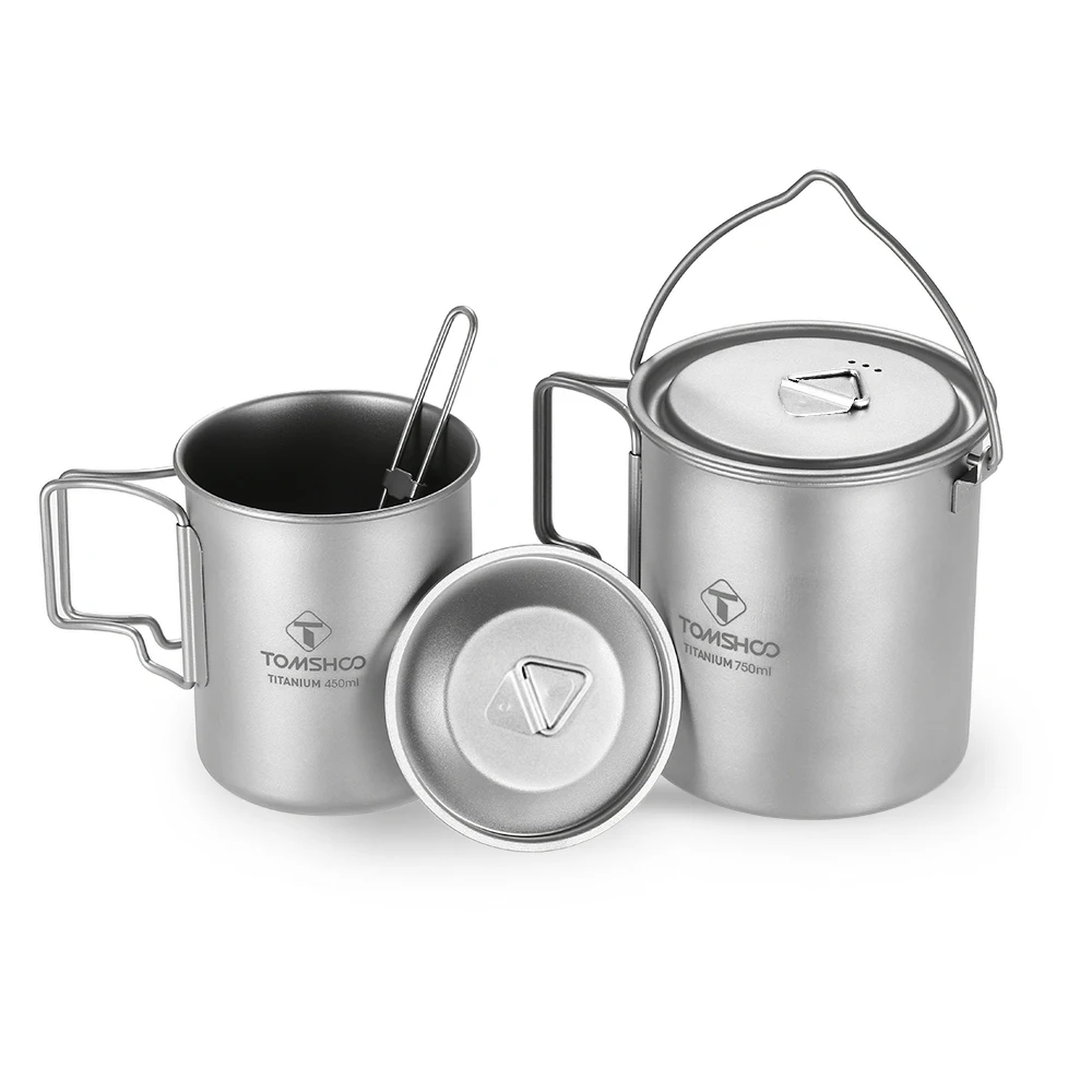 Набор из 3 предметов: Полный титановый набор включает кастрюлю на 750 мл, чашку на 450 мл и складную свинку, отлично подходит для кемпинга, походов, пеших прогулок, приключений на свежем воздухе и выживания.
