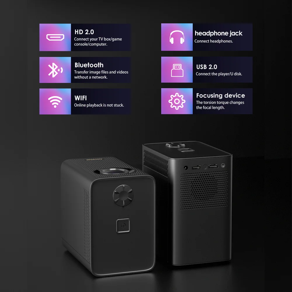 Проектор имеет один HDMI и один USB порт, которые способны подключать и проектировать ваш ноутбук, Macbook, TV stick. Когда вы находитесь на открытом воздухе или когда сигнал WiFi слабый, вы можете использовать usb-порт для воспроизведения видео с флеш-накопителей, портативных жестких дисков, iPhone и телефонов Android.