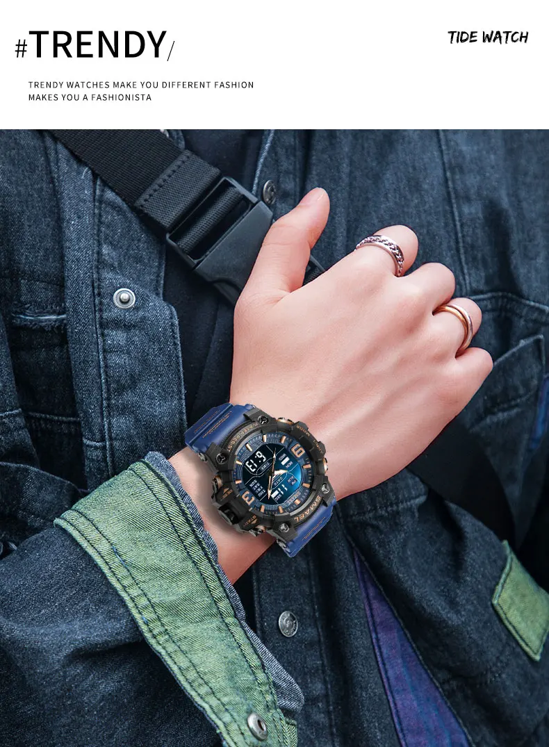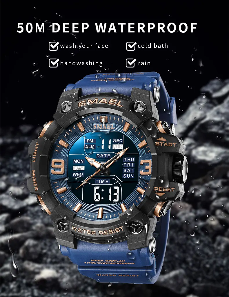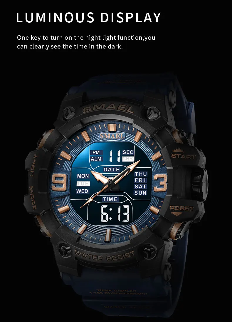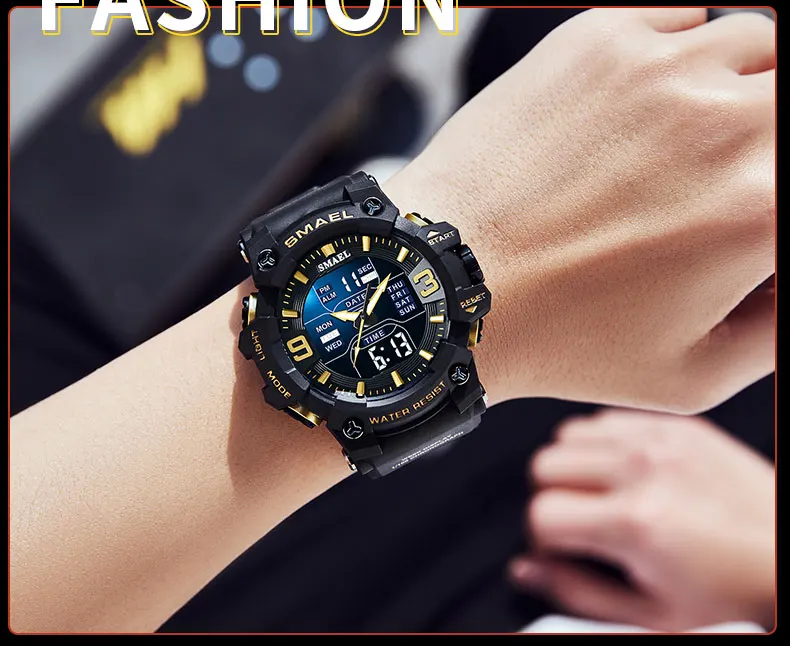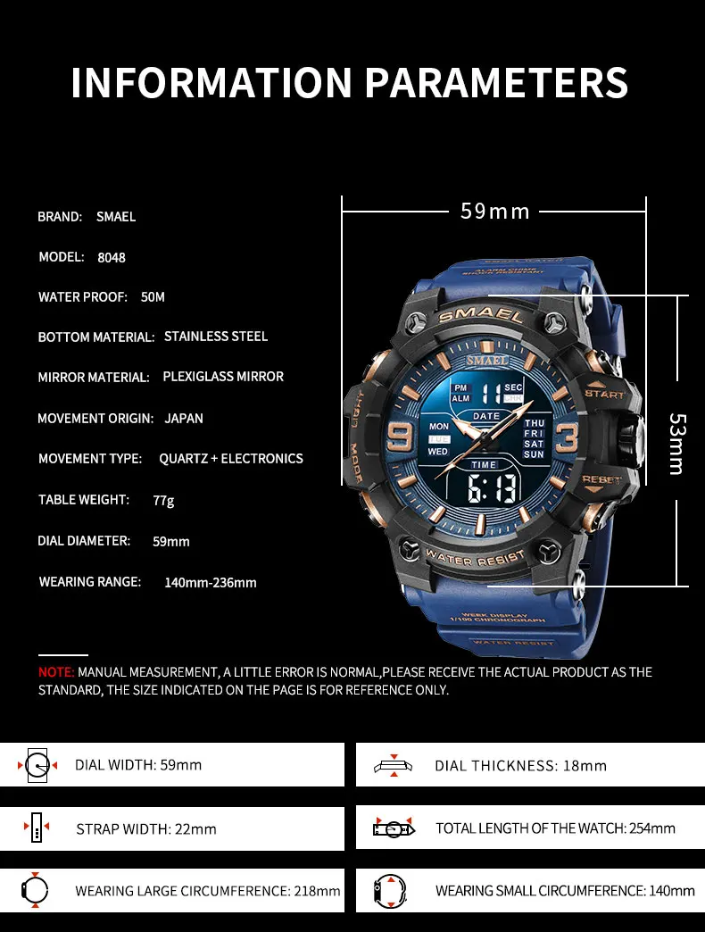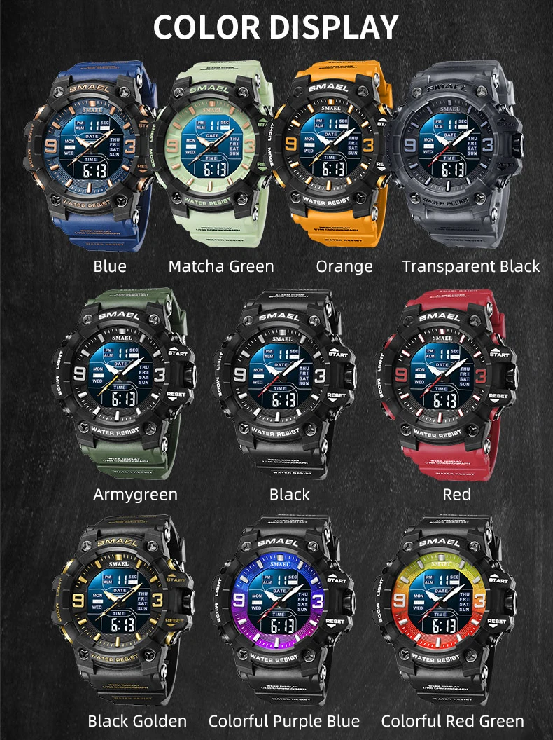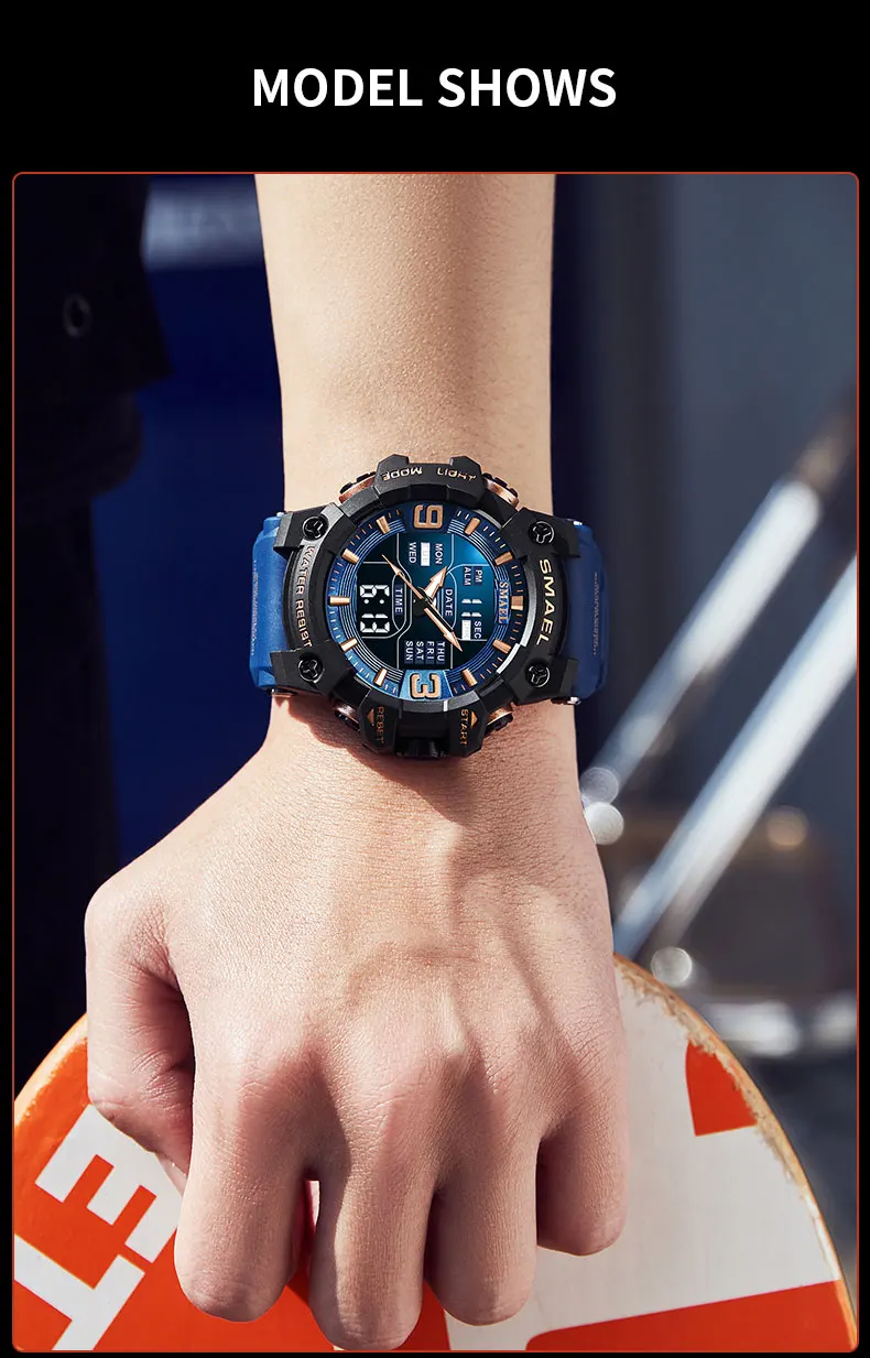 1. Бренд: SMAEL2. Двойное Отображение времени с функцией светодиодный подсветки3. Водонепроницаемость 50 м4. Тип: мужские спортивные часы5. Движение: оригинальный японский цифровой механизм6. Есть 10 цветов на выбор8.-ширина ремешка: Ширина: (приблизительно) 2,2 см9. Циферблат Диаметр: (приблизительно) 5,3 см10. Материал ремешка: прочная искусственная кожа11. Материал корпуса: прочная резина + Высокопрочное закалённое стекло12. Застежка: Пряжка13. Точное отображение времени14. Это хороший подарок для кого-то особенногоПримечание: Мы рекомендуем не носить его во время плавания. Но если вы идете плавать или нырять, пожалуйста, не нажимайте кнопки под водой!Компоненты в комплекте:-1 x оригинальные часы SMAEL-Руководство по эксплуатации-1 шт.