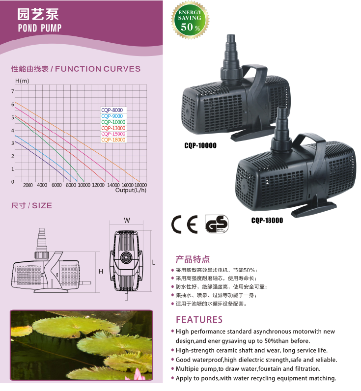 Low-lever suction and low noise High performance standar asynchronous motor with new design, and energy saving up to 50% than before. big filter basket design makes the maintenance much longer. Double seal of resin and rubber ring make it more safe for using. High-strength ceramic shaft and wear, long service life. It has a good waterproof, high dielectric strength, Applys to ponds, with water recyling equipments matching.CQP-18000 pond pump date: