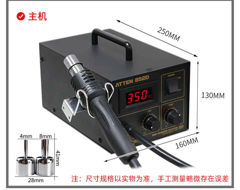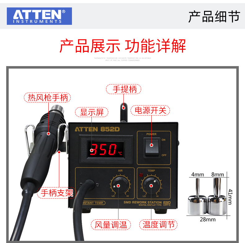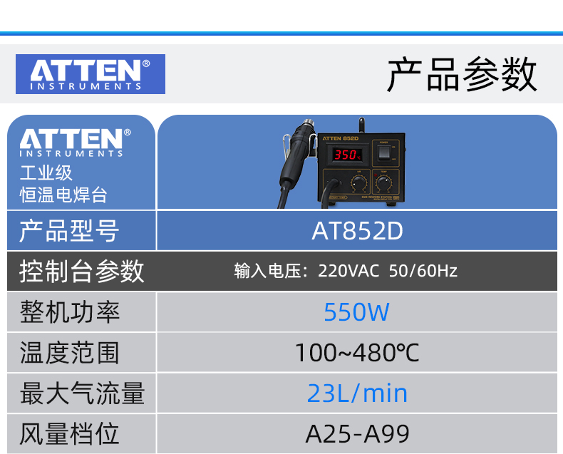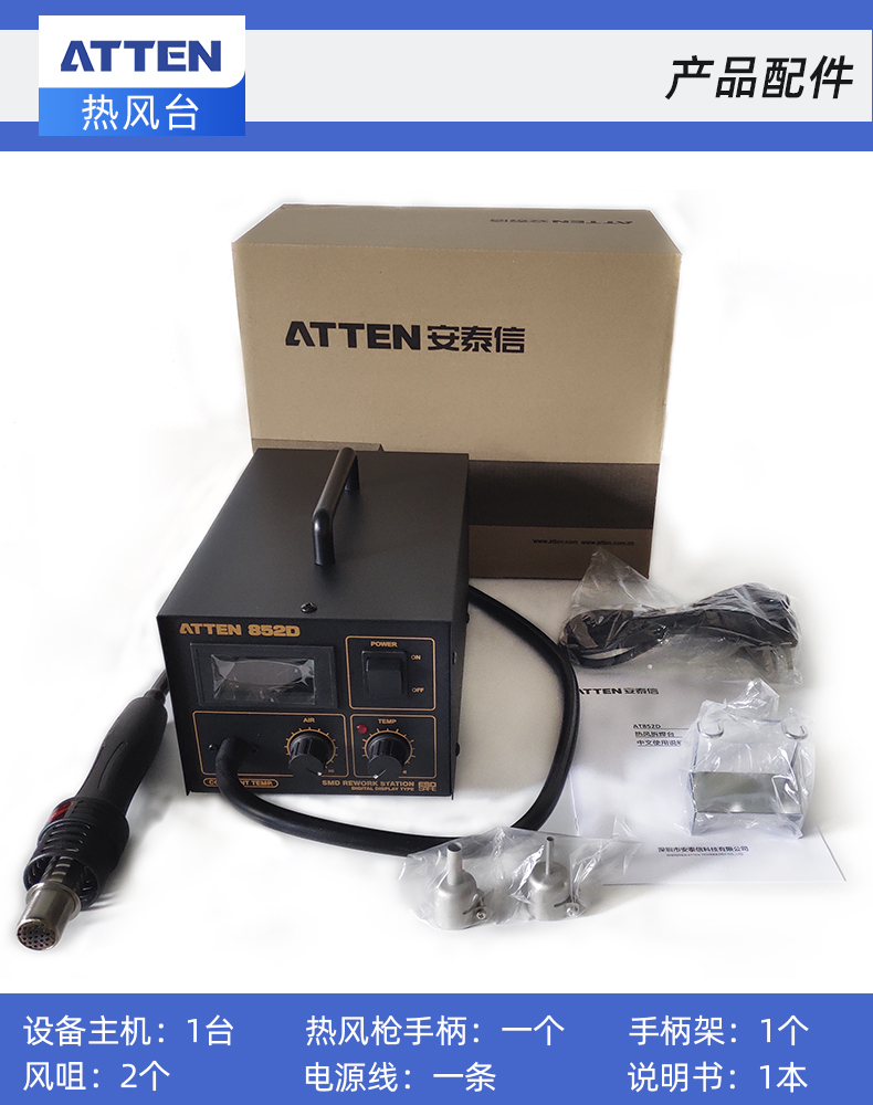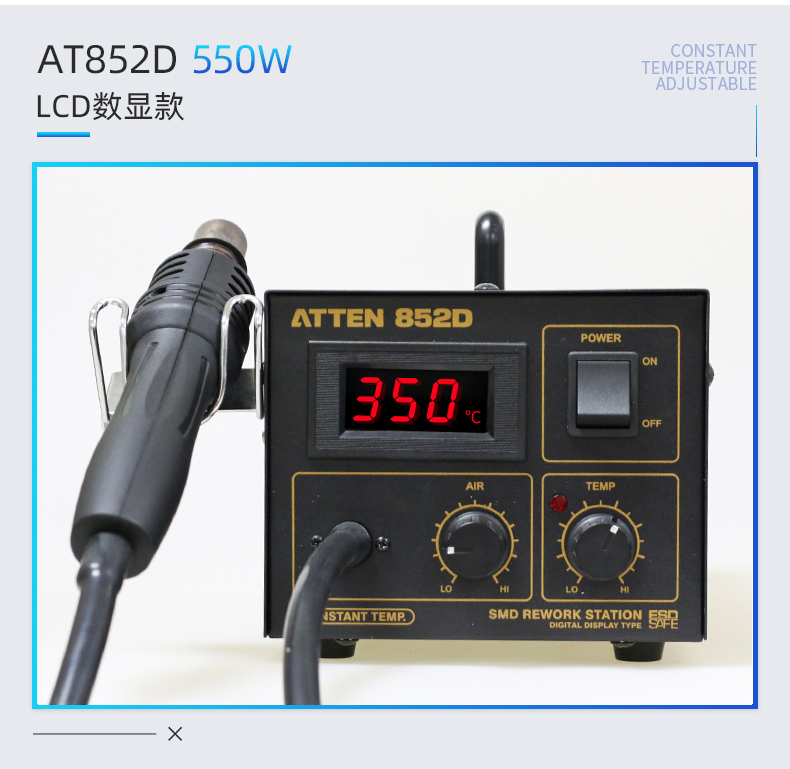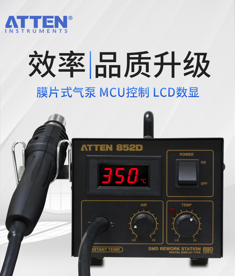ATTEN AT850D Hot Air Rework Station with accurate and stable temperature, ESD safe, suitable for QFP, PLCC, SOP, BGA, etc