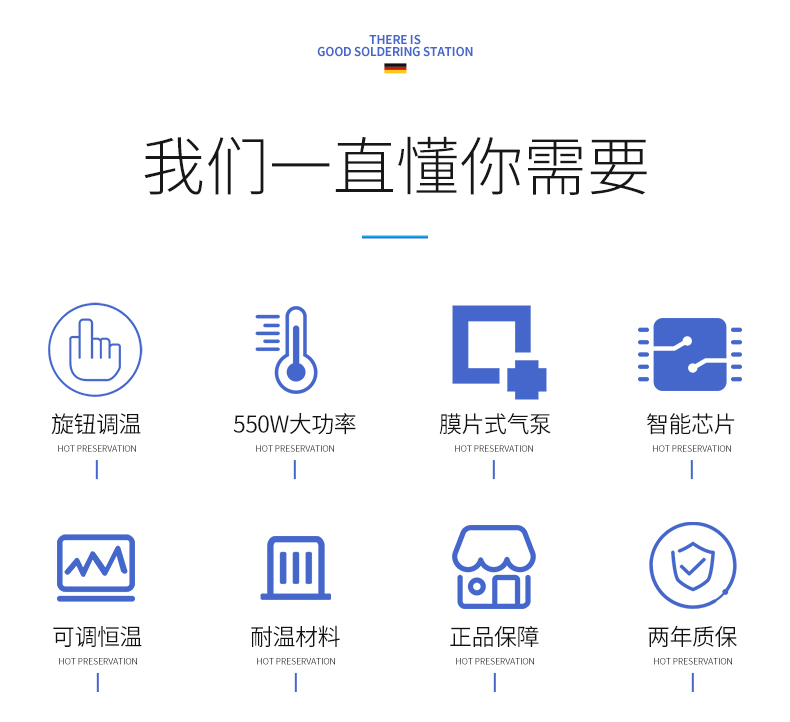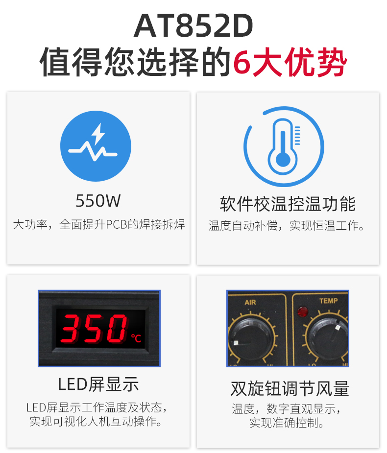 Closed loop control of sensor, accurate and stable temperature, which can safely desolder the temperature-sensitive components, such as QFP, PLCC, SOP, BGA and so on.